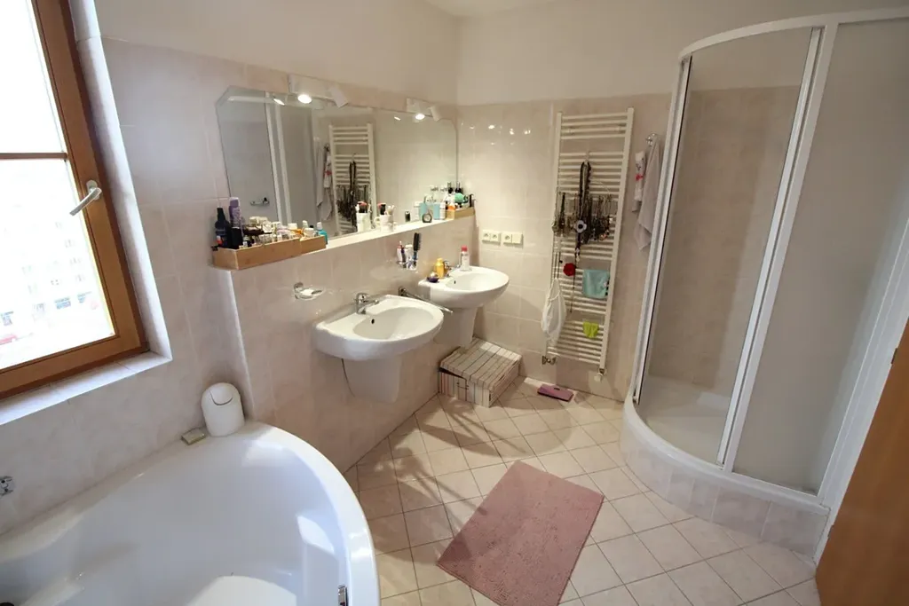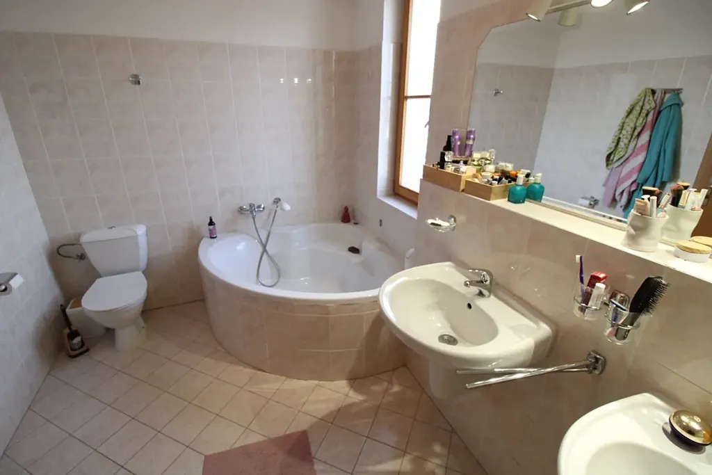K dispozici je koupelna s rohovou vanou, sprchovým koutem a WC a dále samostatné WC, což zvyšuje komfort bydlení. Vytápění je řešeno vlastním plynovým kotlem.