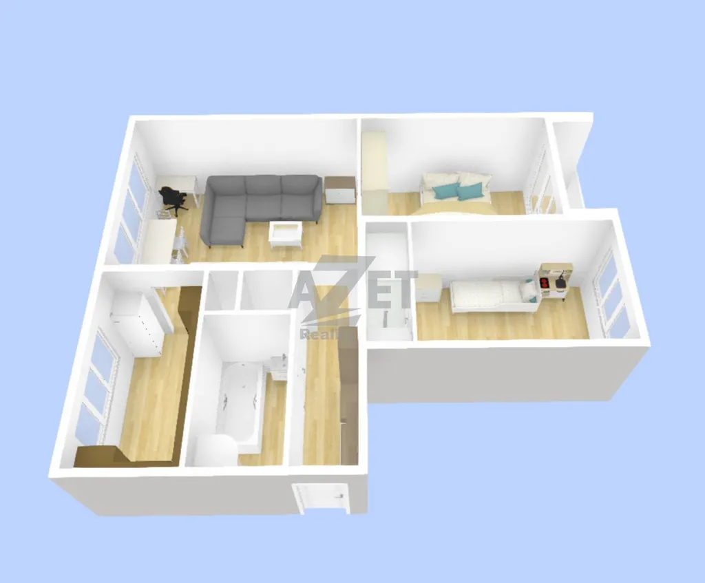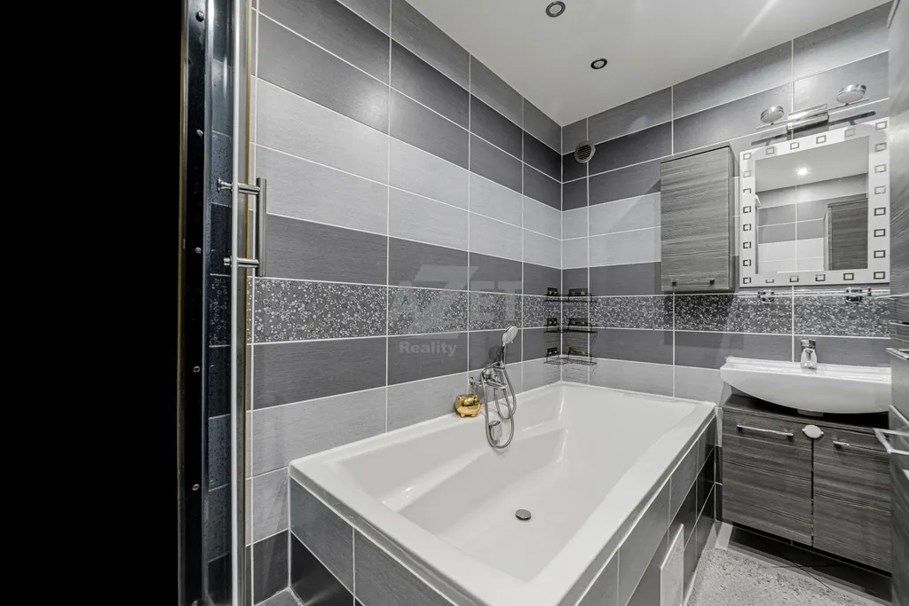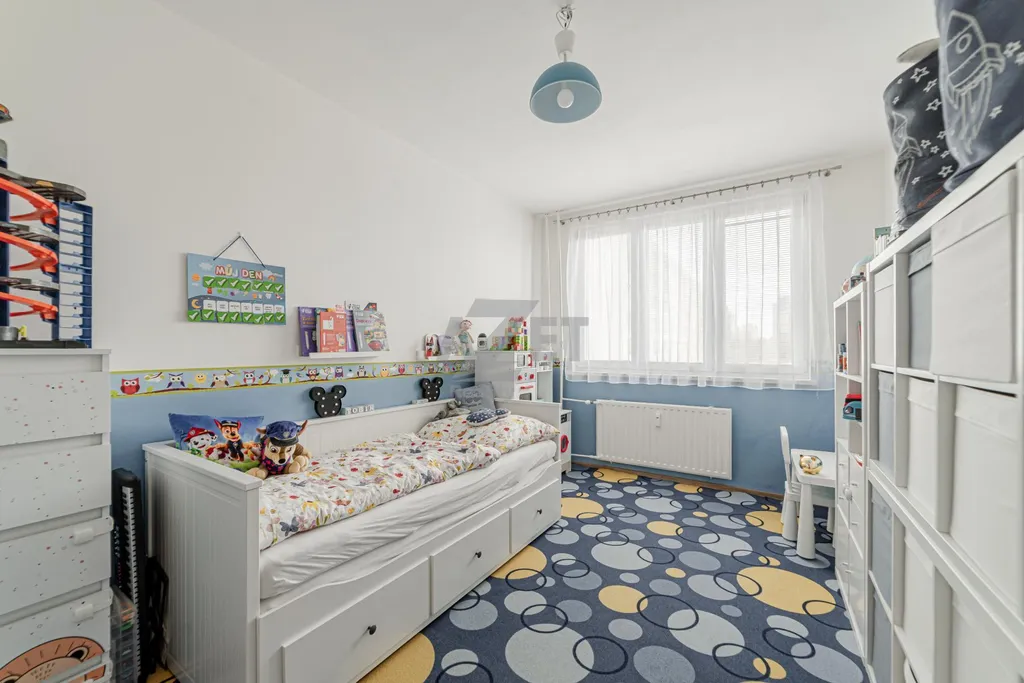 Umístění bytu je v 5. nadzemním podlaží (4. patro) z osmi. Vstup do bytu je zabezpečen bezpečnostními dveřmi. Jednotlivé místnosti jsou neprůchozí, vyjma obývacího pokoje. Kuchyňská linka je rohová s vestavnými spotřebiči uzpůsobená potřebám a požadavkům majitele s použitím kvalitních materiálů. Lednice je samostaně stojící. Ložnice s navazující lodžií je dostatečně velká nejen pro manželkou postel, ale také pro šatní skříň a případně pro dětské postýlky. Vstup do dětského pokoje je skrze malou chodu s vestavěnými skříněmi poskytující velký úložný prostor. Koupelna, která je díky promyšlené rekonstrukci nadstandardně velká pro umístění pračky, vany a sprchovacího boxu. Vana pro dva je nadstandardních rozměrů 90 na 190 cm. WC je samostatné. Jádro bytu je zděné z Ytongu. K bytu náleží standardní sklepní kóje.