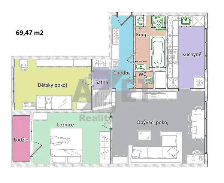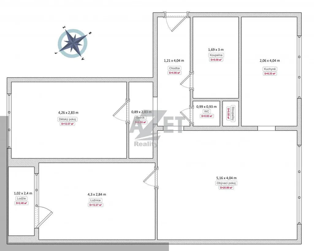 Rozměry jednotlivých místností jsou uvedeny v půdorysu bytu.