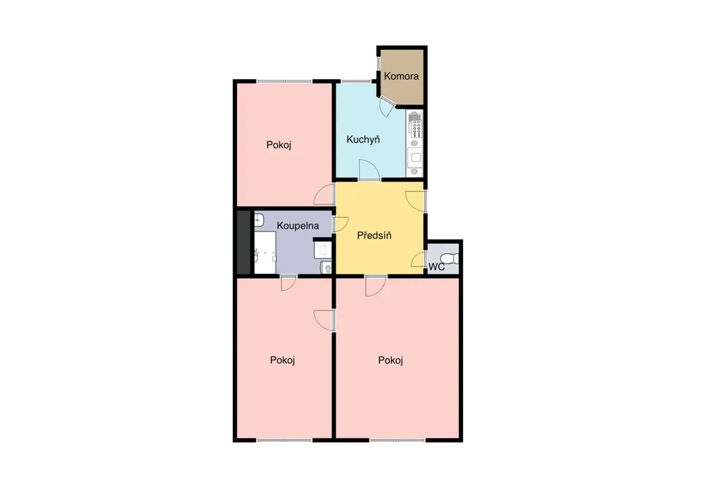 Dispozici bytu tvoří samostatná kuchyně s oknem a praktickou kuchyňskou linkou včetně myčky nádobí. V kuchyni je dostatek prostoru i pro jídelní stůl se židlemi. Dále jsou zde tři velké obytné místnosti s krásnými udržovanými parketami.