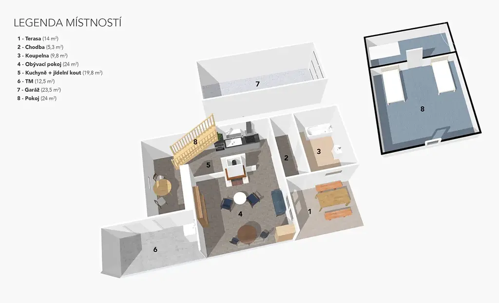 Dřevěné schody propojují obývací pokoj s patrem, které poskytuje prostor na spaní