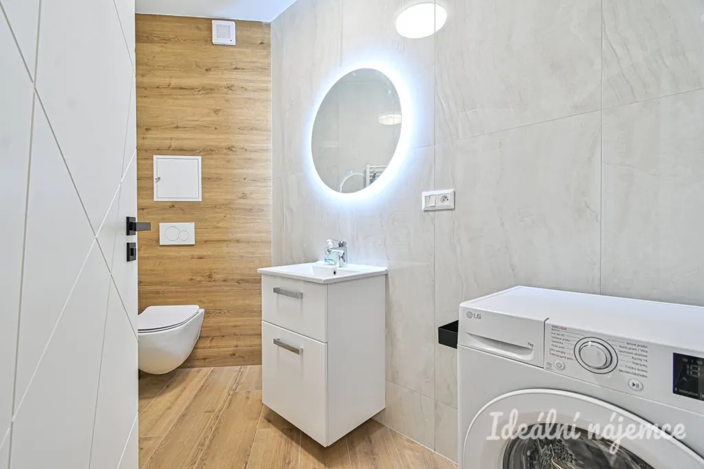 Byt se nabízí vybavený dle fotografií. Hlavní obytný prostor je světlý a vzdušný, propojený s kuchyňským koutem, který disponuje základními spotřebiči. Koupelna je moderně řešená, součástí je sprchový kout, umyvadlo, pračka a toaleta. V bytě je také dostatek úložného prostoru.
