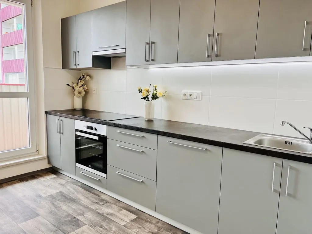 Kuchyňská linka je dělaná na míru a je opatřena vestavěnými spotřebiči (sklo keramická deska a trouba), digestoř.