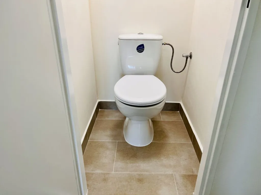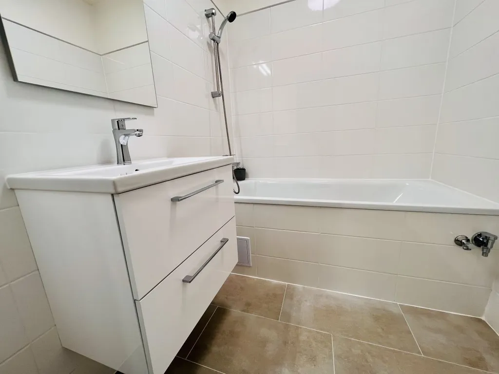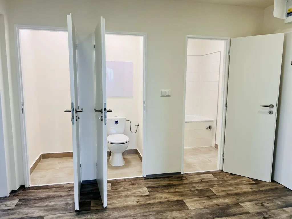 Koupelna disponuje vanou a umyvadlem s vestavěnou skříňkou a s možností připojení pračky, toaleta je odděleně. Byt disponuje i komorou.