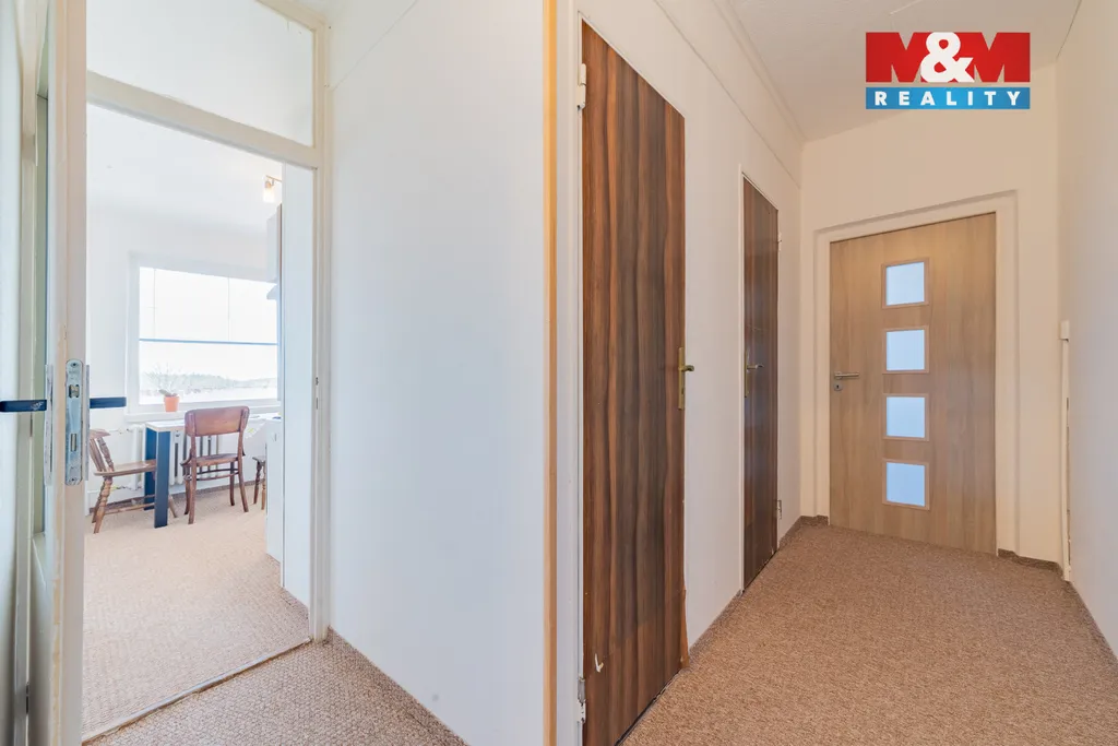 Dispozice bytu nabízí velkorysý obývací pokoj, dvě samostatné ložnice a kuchyni s jídelním koutem. Byt je v dobrém stavu a působí vzdušně a světlým dojmem. Díky umístění ve vyšším patře si užijete klid a pěkný výhled do okolí. Vytápění a ohřev teplé vody jsou řešeny dálkovým rozvodem, což zajišťuje pohodlí bez starostí.