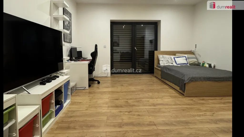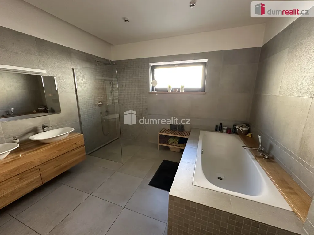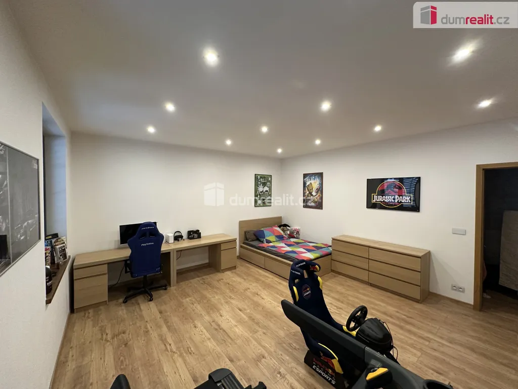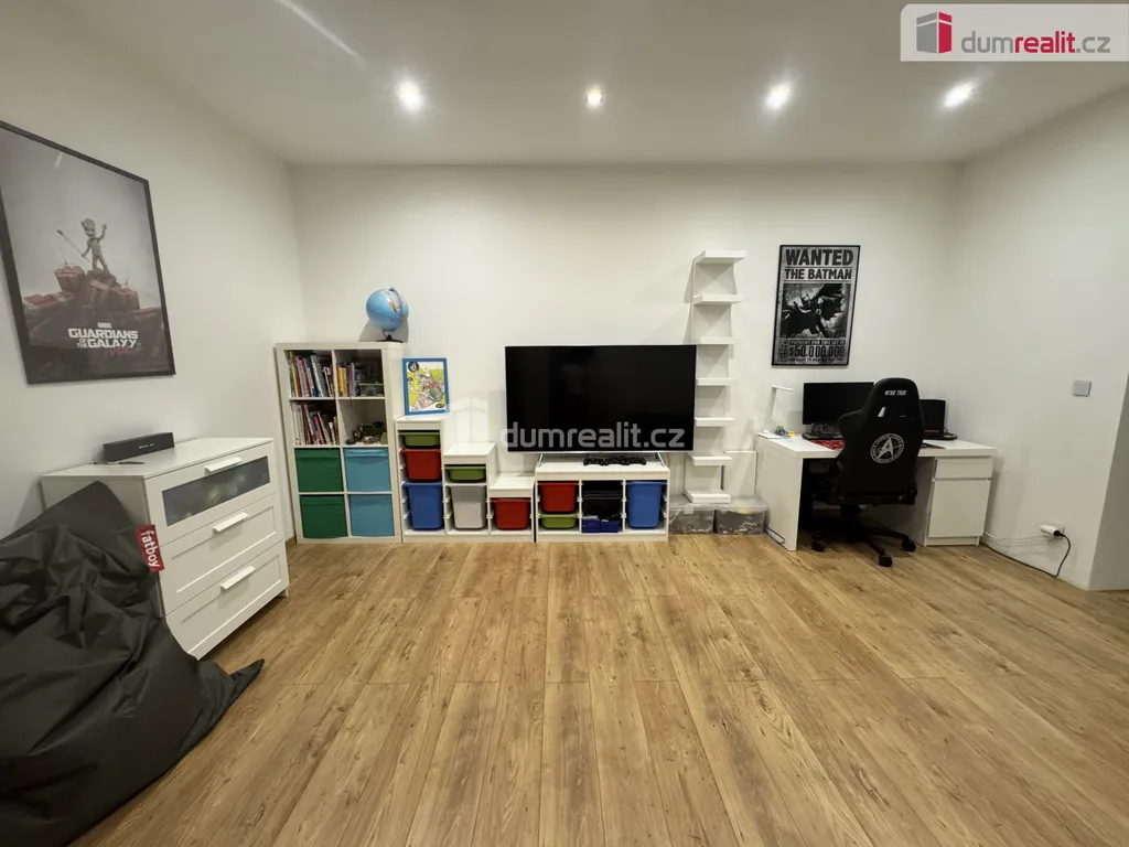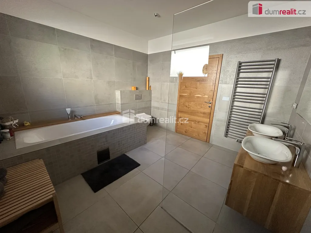 Z obývací částí domu pak dále vstupujeme do 4 samostatných místností v podobě dvou dětských pokojů, ložnice a pracovny. Samozřejmostí je prostorná koupelna s toaletou a šatna. Po dřevěných podsvícených schodech se dostáváme do patra, které tvoří vstupní část domu. Opačným směrem ve vstupním vestibulu sejdeme pouze pár schodů a tím se dostaneme do technické části. Zde je umístěn velmi moderní plynový kondenzační kotel, který obstarává teplou vodu a teplo domova. Dále do navazující sklepní části, která slouží i jako prádelna.