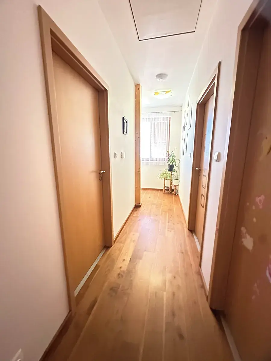 • Chodba s přístupem na pochozí půdu (zateplená, obložená OSB deskami, umístěné zařízení pro internet 350 Mb/s a kamerový systém, malé střešní okno s přístupem na střechu - střecha Bramac)