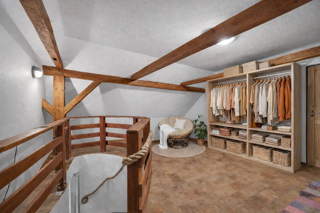 Podkroví - otevřený prostor kolem schodiště, který lze užívat jako čítárnu nebo společnou šatnu, ložnice s šatnou, pracovna, která je zároveň koridorem do 2 ložnic, záchodu a koupelny s vanou.