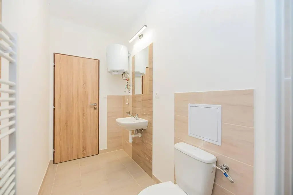 Vytápění bytu zajišťují elektrické přímotopy, ohřev vody je řešen bojlerem. K bytu náleží sklepní kóje, která poskytuje další úložný prostor.