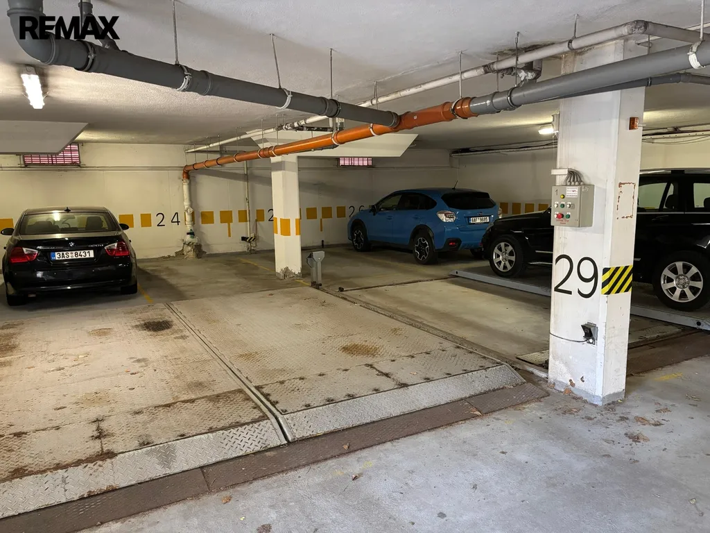 Vjezd do garáže je zajištěn přes automatická vrata na dálkové ovládání, přístup mají pouze vlastníci a nájemci domu.