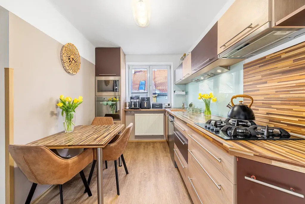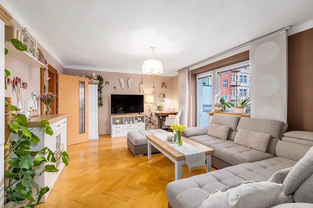 Dispozičně velmi hezky řešený byt 3 + 1 o velikosti 70 m2 prošel velmi stylovou rekonstrukcí. Díky tomu může nabídnout velice nadstandardně řešené prostory koupelny, praktickou komoru, opravdu velké pokoje a tolik žádaný balkon do vnitrobloku domu ( 4m2 ). A nejen to. Obývací pokoj ( 21m2 ) s balkonem na jižní stranu poskytne dostatek prostoru i větší rodině. Pokojíček pro děti je situován v zadní části bytu za kuchyní a lze ho propojit i s ložnicí. Současným majitelům byt vyhovoval v tomto uspořádání, Vy už si můžete zvolit jiné.