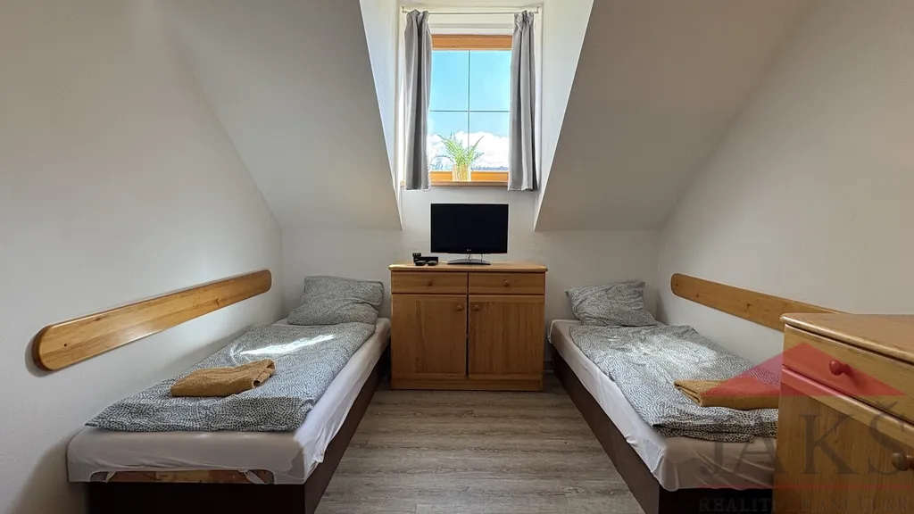 Popis: chodba 3,72 m2 (šatní skříň), koupelna 2,94 m2 (sprchový kout, umyv. se zrcadlem, WC), obývací pokoj 10,93 m2 s kuchyňským koutem (kuch. linka s dřezem, el. dvou-vařičem, MV trouba s grilem, RV konvice, kávovar, lednice s mrazákem; komoda s TV, stůl a 4 židle, rozkládací gauč – 2 lůžka) a ložnice 11,28 m2 (komoda s TV, palanda a dvě postele – 4 lůžka). Vyhrazené a vymezené parkovací místo (výhradní užívání) přímo za domem a možnost uskladnění lyží a kol ve společném zahradním domku.