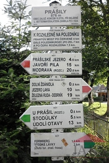 Horská obec Prášily (910 m.n.m.; vyhlášená cukrárna a restaurace U Michala, obchod, pošta, OÚ, dětské hřiště, kurty, lanový park, archeopark - kelti, bizoni...), ležící v samotném centru NP Šumava a je významným turistickým střediskem s východiskem pro řadu atraktivních cílů jako je ledovcové Prášilské jezero, jezero Laka, rozhledna Poledník (1.315 m.n.m.), apod..