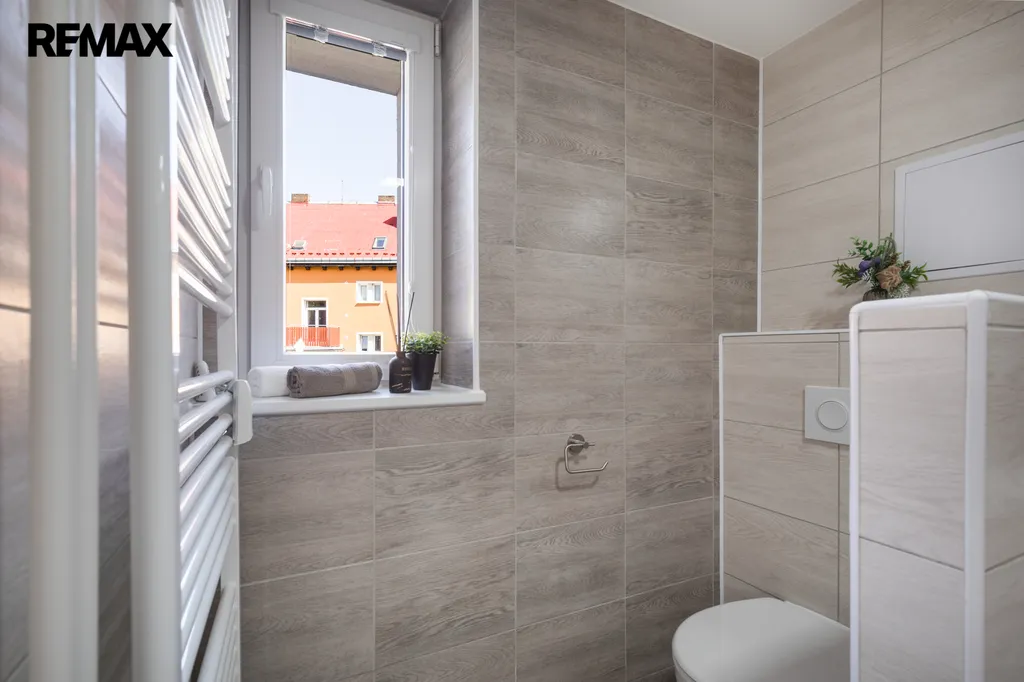 ✅ Koupelna spojená s WC, s vanou se zástěnou pro příjemnou koupel i sprchování, umyvadlem, LED osvětlením s galerkou / okno