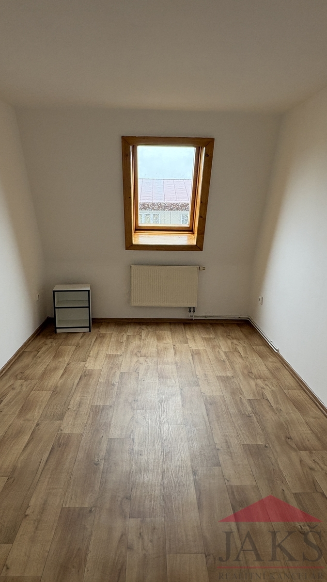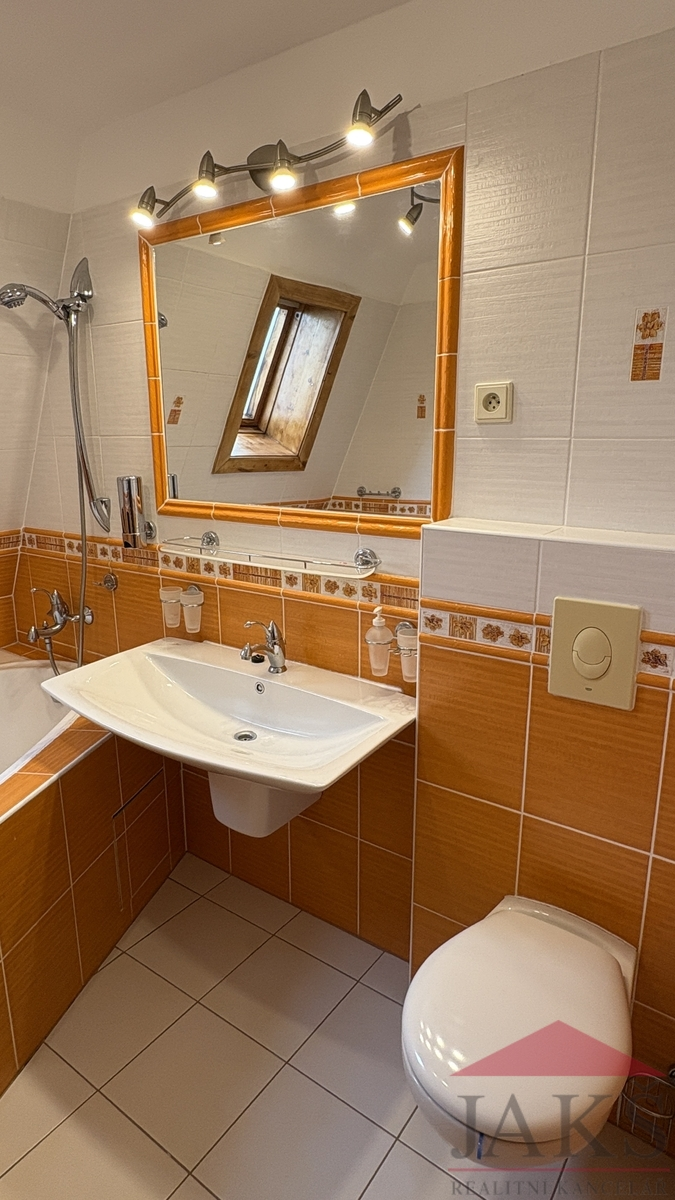 Popis: vydlážděné parkovací místo před domem; suterén 42,33 m2; garáž, technická místnost (el. boiler, umyv., vývod na pračku, rozvod dálkového topení pro sousední řadovky), chodba s dřevěným schodištěm do 1.NP 43,52 m2: podesta (kazetové dveře), sam. WC s umyv., prostorný obývací pokoj 36 m2 s kuch. koutem (kuch. linka s vestavěnou lednicí s mrazákem) a franc. dveřmi na terasu se zahradou; 2.NP 36,05 m2: podesta, koupelna (umyv. se zrcadlem, velká rohová vana, WC, topný žebřík) s oknem, 2x ložnice (vestavěné šatní skříně) a nízká půda.