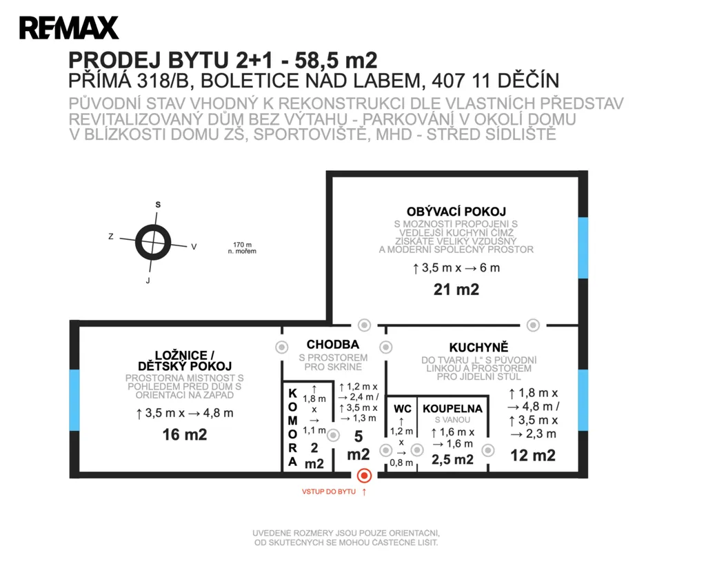 nabízíme Vám k prodeji bytovou jednotku v osobním vlastnictví s dispozicí 2+1 s celkovou užitnou plochou 58,5 m2, nacházející se v 1. patře panelového domu bez výtahu v ul. Přímá 318/b v Děčíně, městské části Boletice n. Labem. K bytu náleží komora v mezipatře a dvě sklepní kóje.