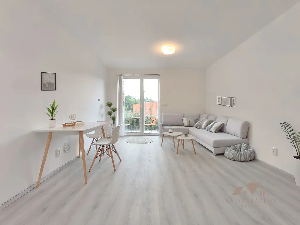 Byt je pár měsíců dokončený a připravený k nastěhování. Součástí vybavení je kuchyňská linka s úložným prostorem až ke stropu a přípravou pro myčku, sklokeramická varná deska, lednice s mrazákem, mikrovlnná trouba s funkcí horkovzdušné trouby a grilu, jídelní stůl se židlemi, konferenční stolky, skříňka v koupelně a skříň na chodbě. V bytě je instalováno podlahové topení a klimatizace, které zajišťují příjemné klima během celého roku. Určitě Vás potěší i předokenní žaluzie, které jsou na el. ovládání. Vše je nachystáno tak, abyste mohli začít bydlet bez starostí. Zbytek je už jen na Vaší představivosti a fantazii. Vytvořte si svůj domov podle sebe a dejte mu osobní charakter. K nemovitosti také patří terasa o celkové ploše 3,1 m² se stolkem a židlemi, menší zděný sklep na všechny "poklady" s možností dobíjení moderních elektrokoloběžek, elektrokol či elektrických skútrů a vlastní parkovací místo, takže konec nekonečnému hledání místa k zaparkování. Novostavba poskytuje příjemně světlý interiér a prostředí, kde se budete cítit dobře od první chvíle.