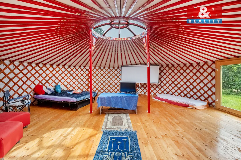 Dům je vytápěn tepelným čerpadlem země–voda, což zajišťuje nízké provozní náklady. Na zahradě najdete i stylovou jurtu pro relaxaci nebo rozšíření služeb.