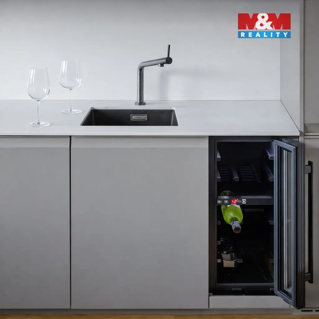 K dispozici jsou veškeré moderní spotřebiče – myčka, digestoř, pračka, elektrická trouba, varná deska, vestavěná lednice, vinotéka i kávovar, což zajišťuje vysoký standard bydlení. Součástí pronájmu je také sklep.