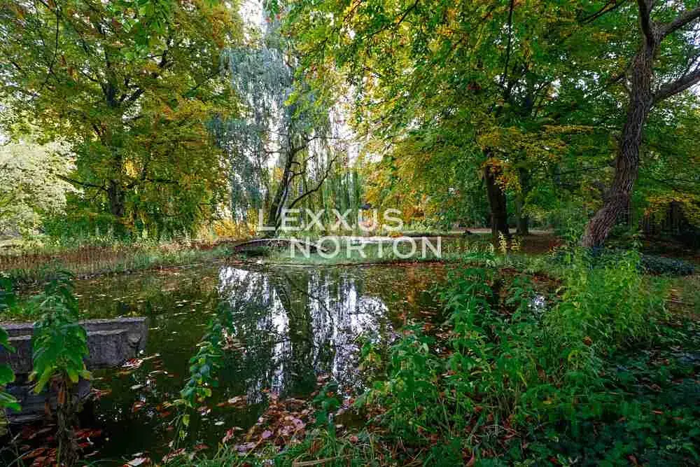 Hlavní vila je orientována do rozlehlé parkové zahrady, která tvoří přirozenou vizuální i kompoziční osu celé nemovitosti. Promyšlená parková úprava zahrnuje jezírka, kašnu, vzrostlé stromy, okrasné keře i historické anglické růže a vytváří harmonické prostředí s charakterem soukromého parku. Zahrada funguje jako samostatný ekosystém s výjimečným klidem a vysokou mírou soukromí. Zároveň je přirozeným prodloužením obytných prostor domu a nabízí velkorysý pocit prostoru.