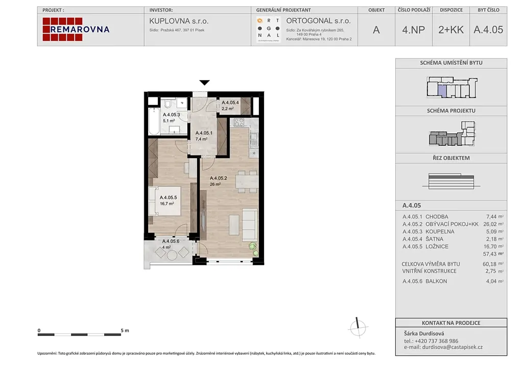 Nabízíme k pronájmu byt 2+kk s balkonem o velikosti 60,2,8 m2 v 4.NP nově postaveného bytového domu REMAROVNA, který je umístěn nedaleko centra města Písku, ve vnitrobloku mezi ulicemi Pražská a V Portyči. K bytu náleží také sklep 2 m2 a parkovací stání "P39" ve společné garáži v suterénu domu. Cena pronájmu parkovacího stání je 1.000,- Kč a bude zahrnuta v nájemném za byt. Celkem tedy čisté nájemné včetně parkovacího stání činí 17.000,- Kč.