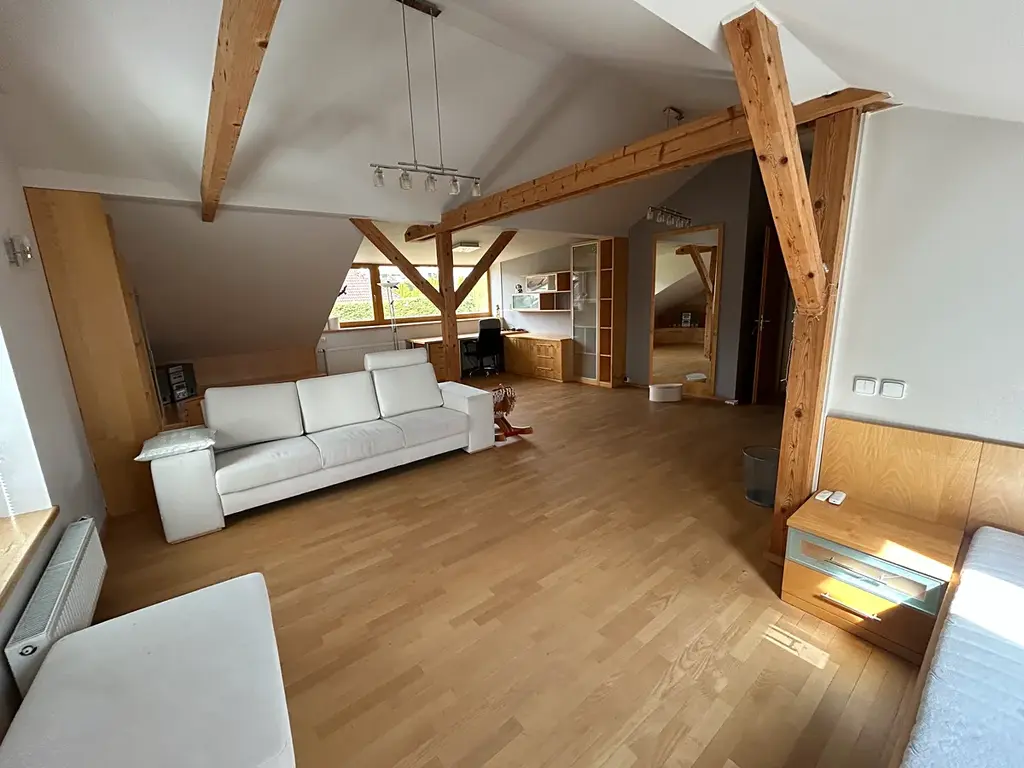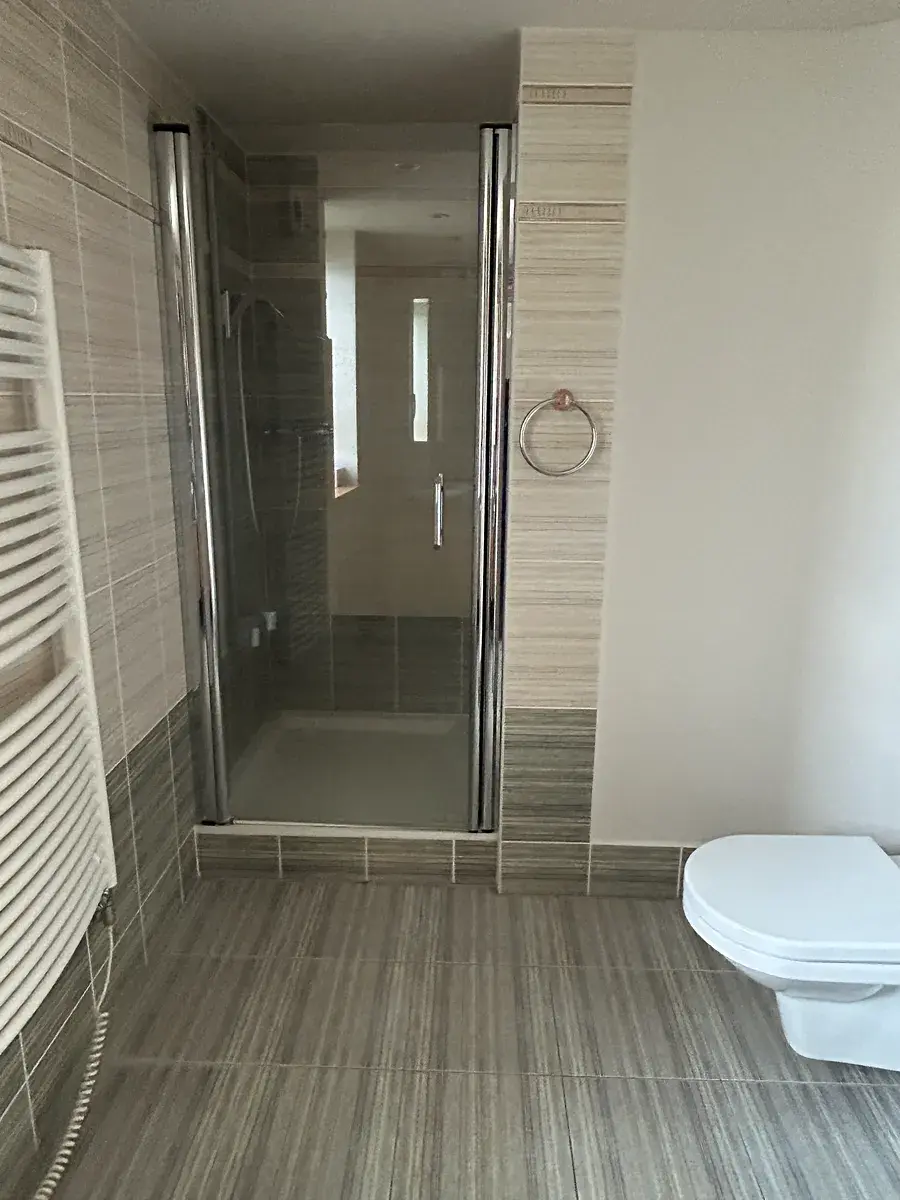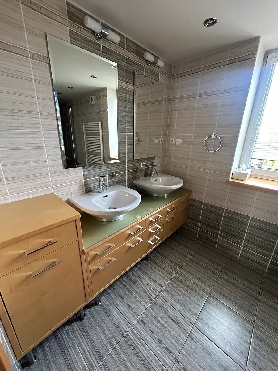 V patře se nachází další velký pokoj, menší pokoj a koupelna se sprchovým koutem, WC a dvěma umyvadly.
