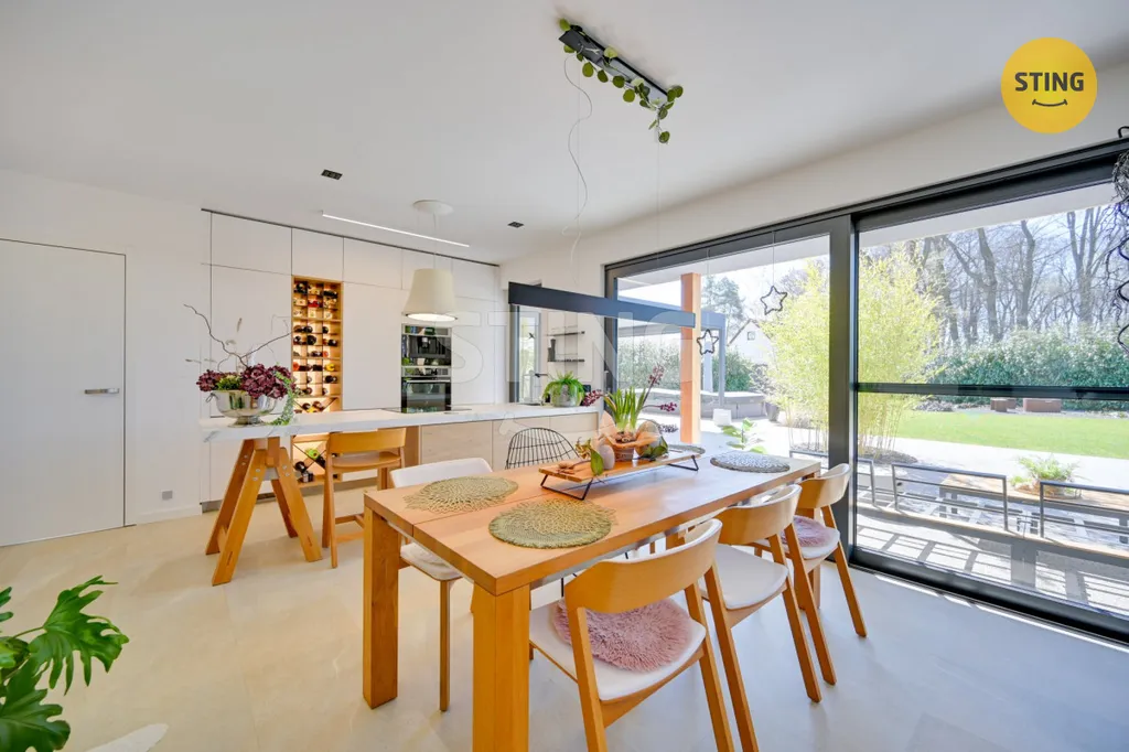 Exteriér domu nabízí rozsáhlou zahradu s maximálním soukromím, zatravněnou plochou a pečlivě navrženou zelení včetně bambusu podle návrhu zahradního architekta. Součástí je bioklimatická hliníková pergola o velikosti 24 m² s otočnými lamelami a elektrickými roletami se senzory proti dešti a větru, která umožňuje komfortní relaxaci za každého počasí. K dispozici je také vyhřívaný bazén s vířivkou Canadian Spa Mollus XXL o rozměrech 10 m² s pískovou filtrací a osvětlením. Terasa kolem bazénu je z materiálu Woodplastic a Terafest premium, doplněná o betonové a kamenné povrchy Piedra. Pro parkování slouží kryté stání pro dvě vozidla, pozemek je oplocen gabionovým plotem s elektrickou bránou a videotelefonem. Na zahradě se nachází také dřevník Korten, ohniště a zahradní domek o velikosti 14 m² s regálovým systémem.