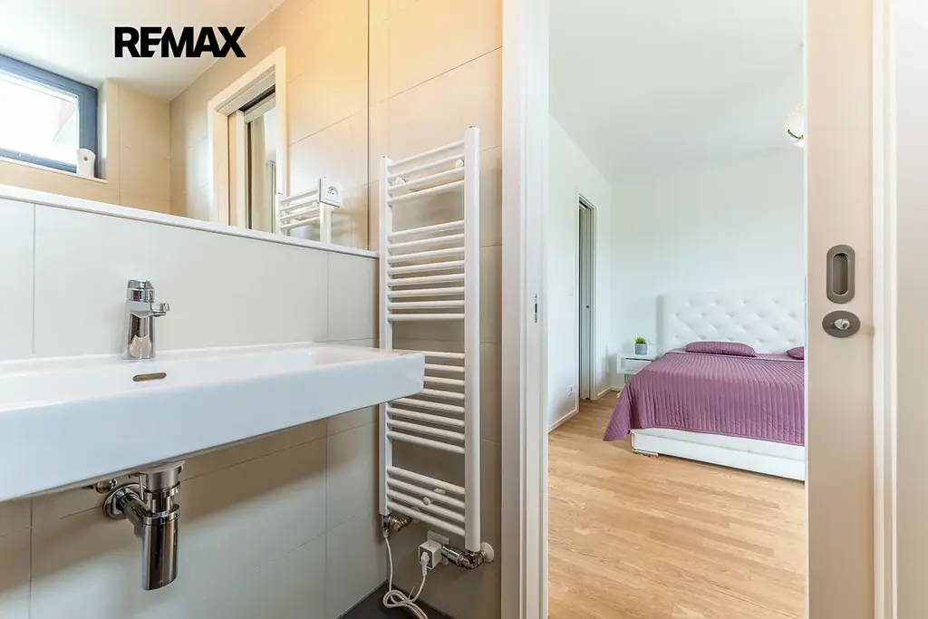 Ve všech obytných místnostech dominuje vysoce kvalitní dřevěná podlaha, velkoplošná francouzská okna a předokenní žaluzie, které zajišťují dostatek světla a soukromí. Koupelny jsou vybaveny italskou dlažbou, čímž dodávají luxusní a moderní dojem. Dům je plně zařízen nábytkem, což znamená, že noví nájemci se mohou ihned pohodlně usadit.