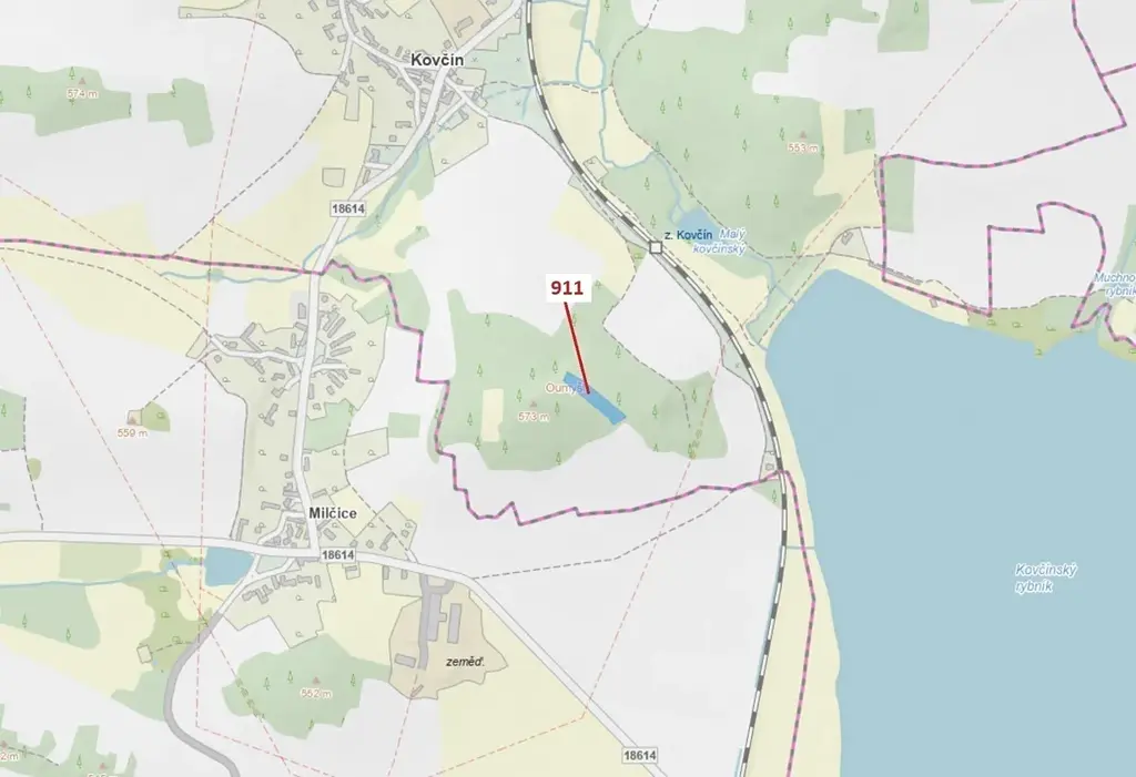 Lesní pozemek o výměře 2882 m2, parcelní číslo 911, podíl 1/1, katastrální území Kovčín, obec Kovčín, obec s rozšířenou působností Horažďovice, okres Klatovy, Plzeňský kraj. Částečně po těžbě.