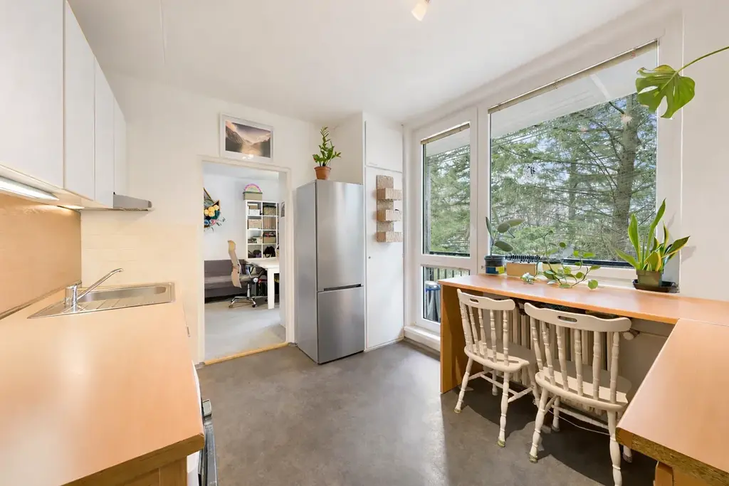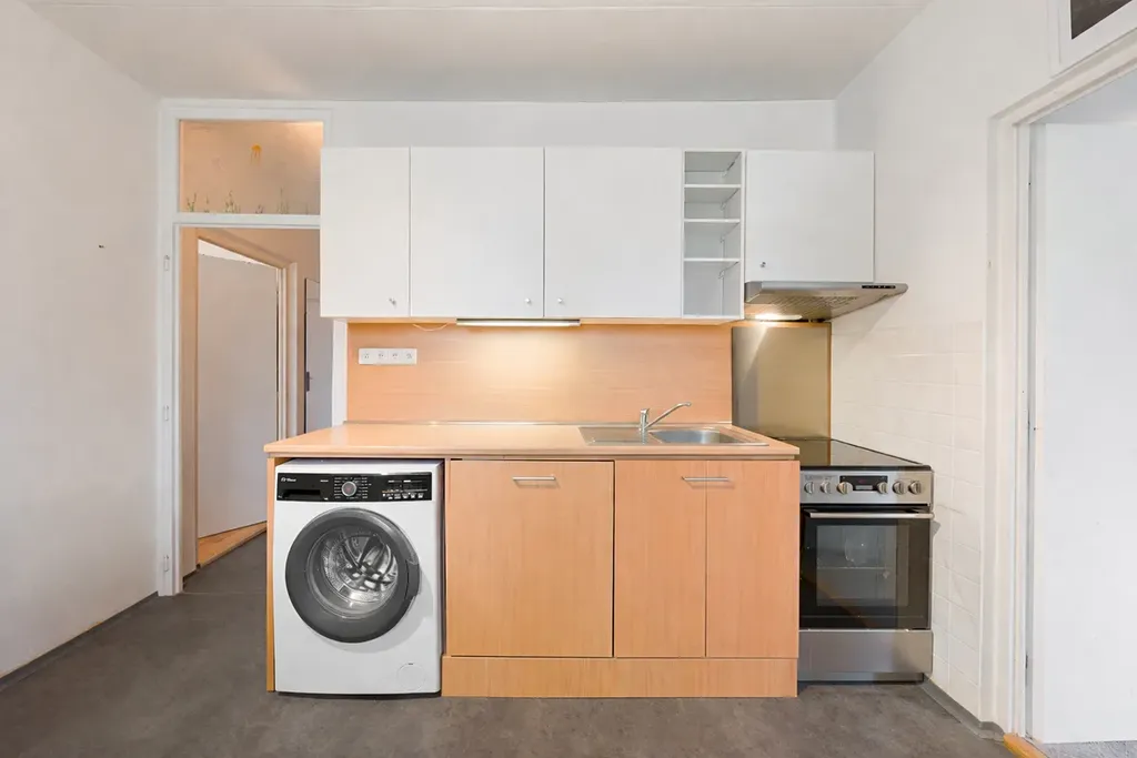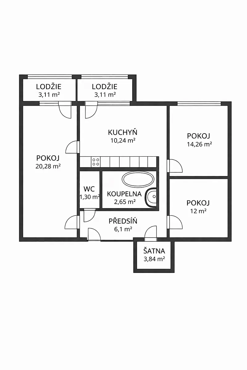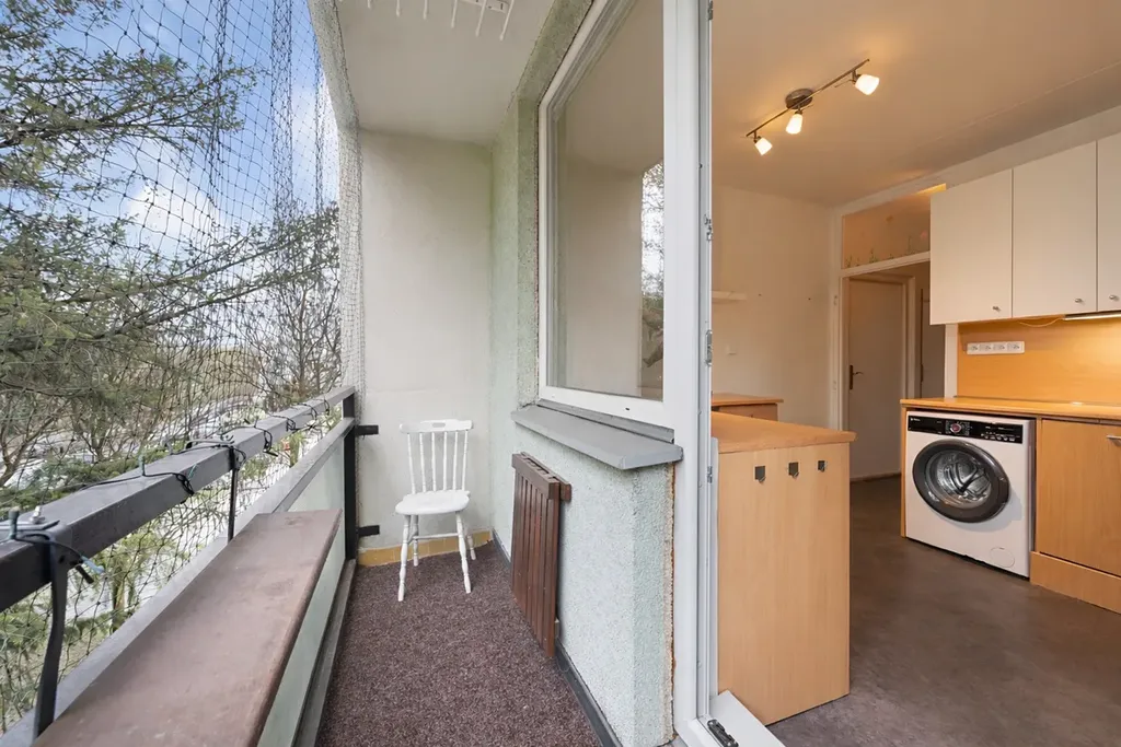 Velkým benefitem jsou dvě lodžie, které jsou přístupné jak z kuchyně, tak velkého pokoje. Oceníte i dostatek úložného místa v podobě šatny o rozměru 3,84 m²a sklepní kóje v suterénu budovy o ploše 5,88 m².