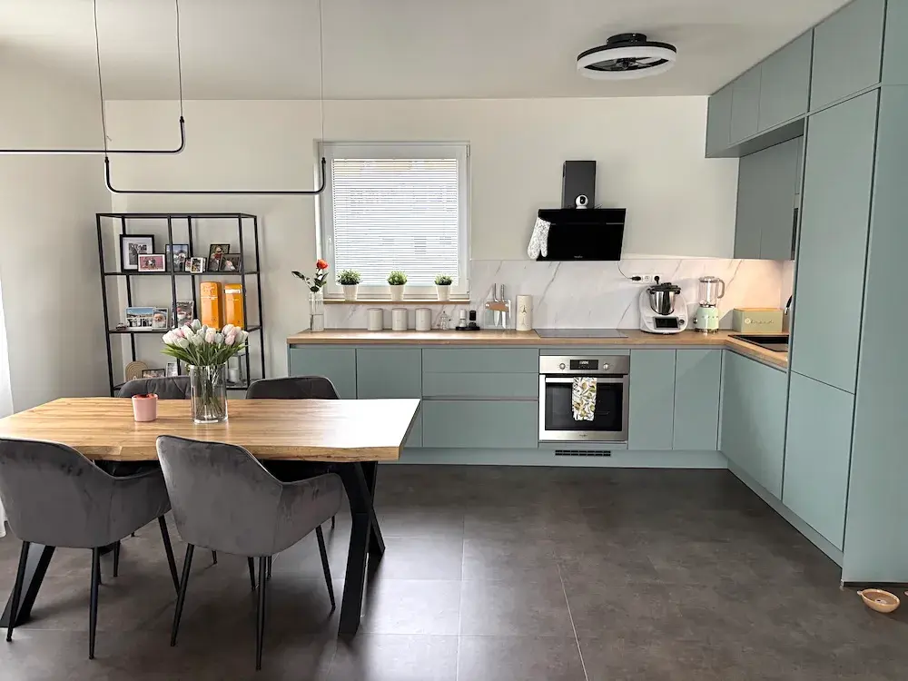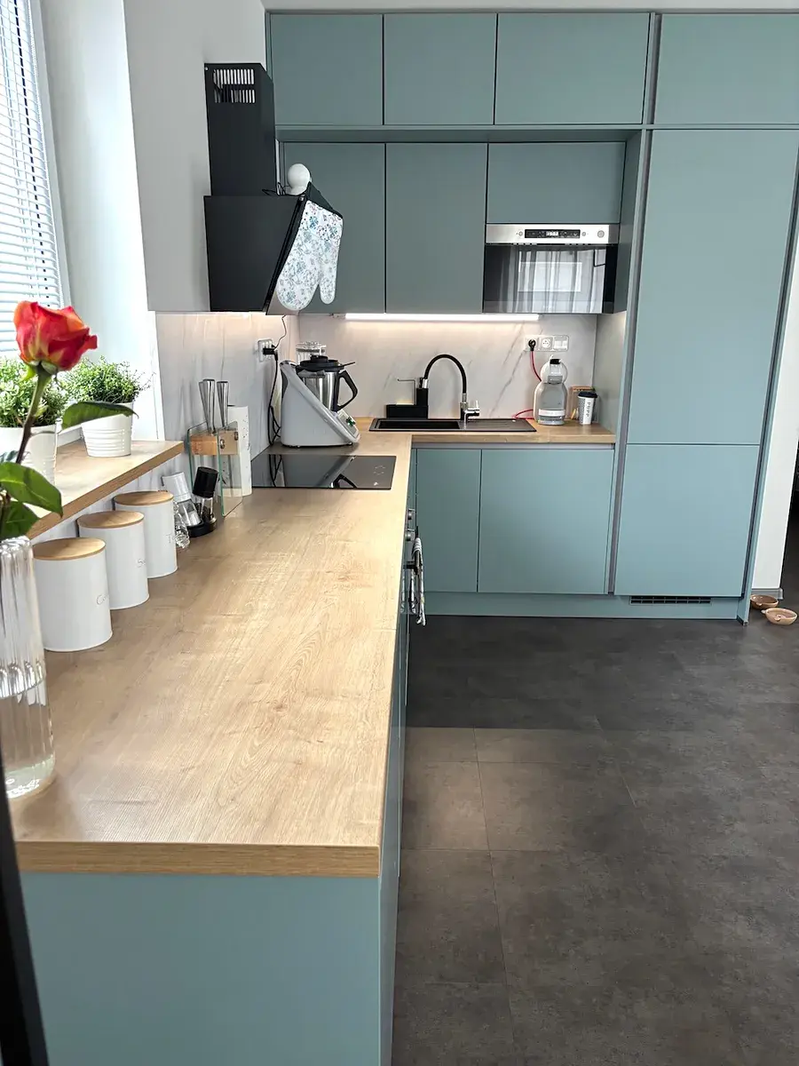 Kuchyňská linka je vybavena indukční varnou deskou, digestoří, elektrickou horkovzdušnou troubou, myčkou nádobí, mikrovlnnou troubou a vestavěnou lednicí s mrazákem.