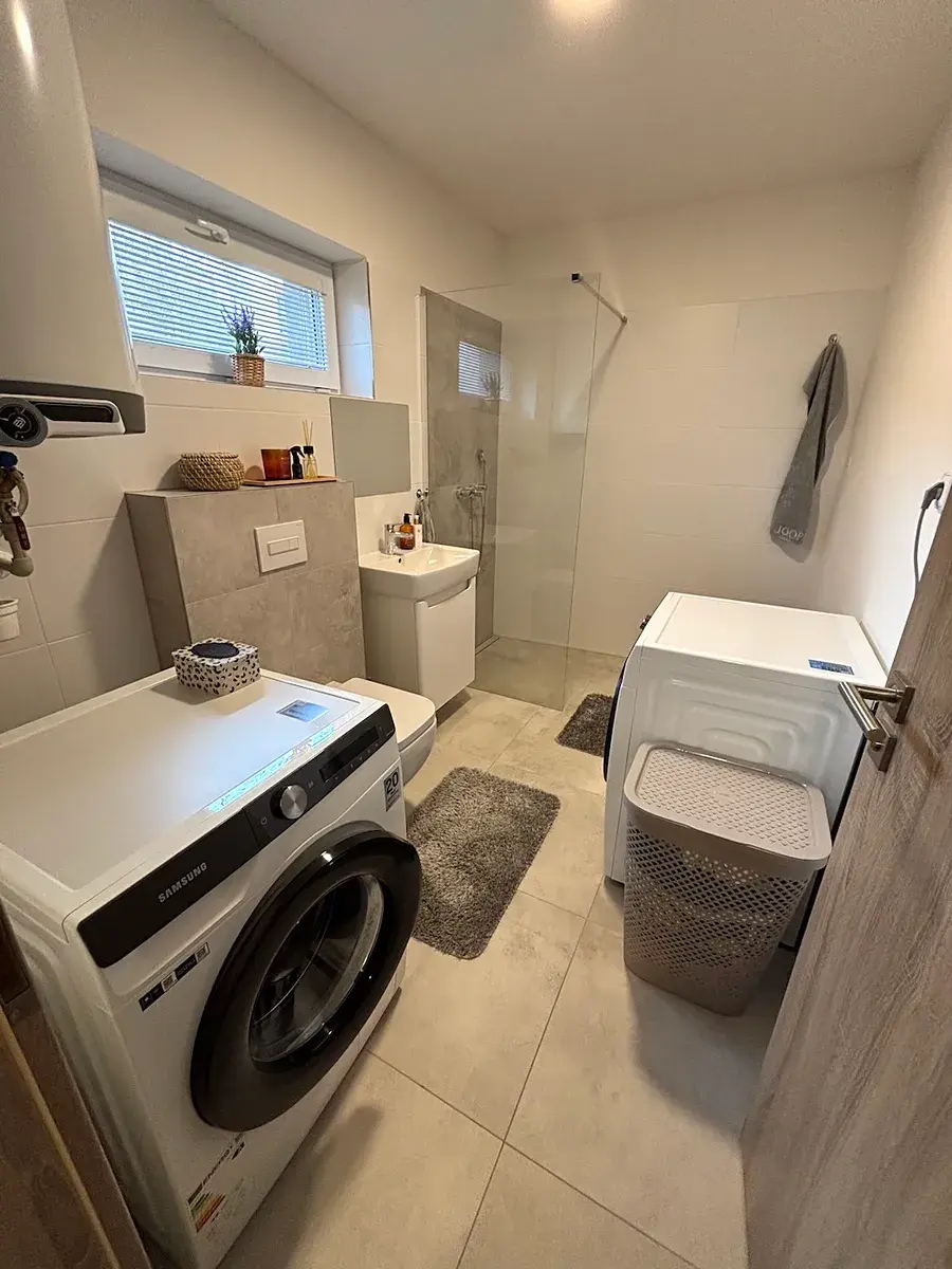 1.NP: garáž s elektronickými vraty, vstupní předsíň, kuchyň spojená s obývacím pokojem, koupelna se sprchovým koutem, společná s toaletou, komora pod schodištěm.
