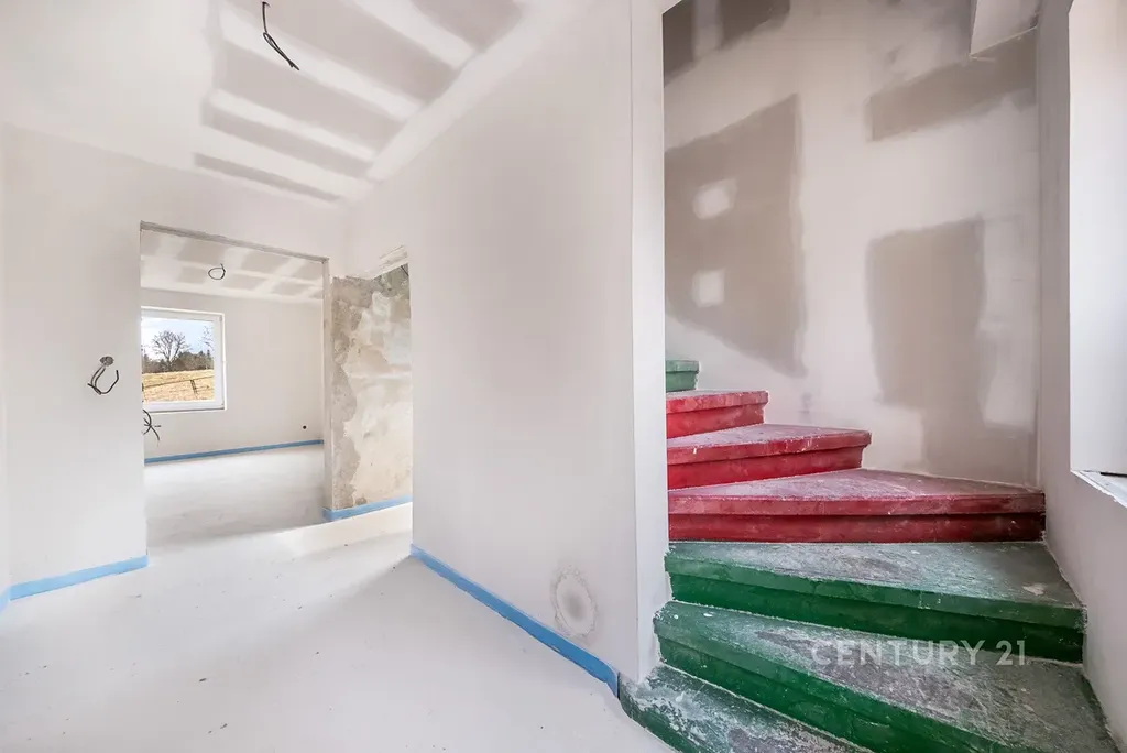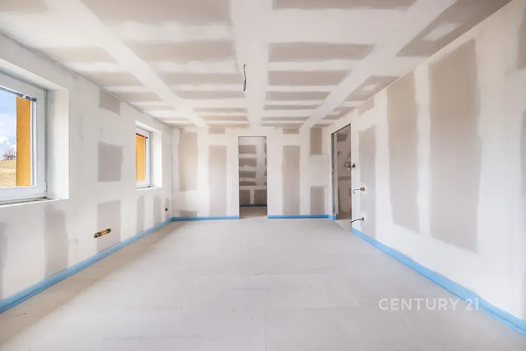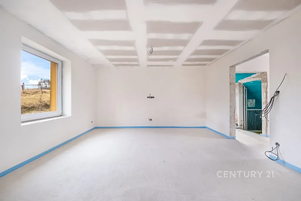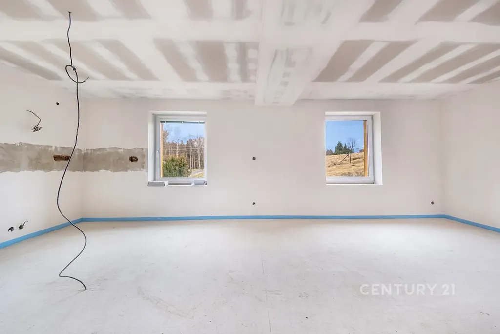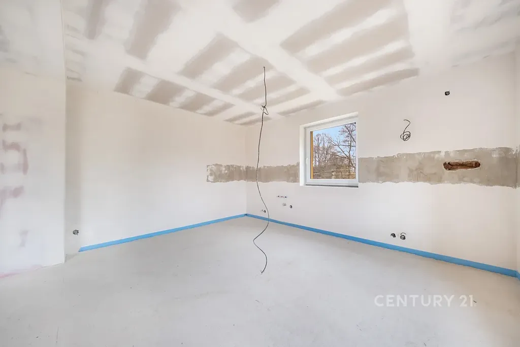 2. nadzemní podlaží (Podkroví): Aktuálně nabízí dva pokoje s potenciálem pro vytvoření ložnice a dětského pokoje. I zde je již hotová příprava na další WC.