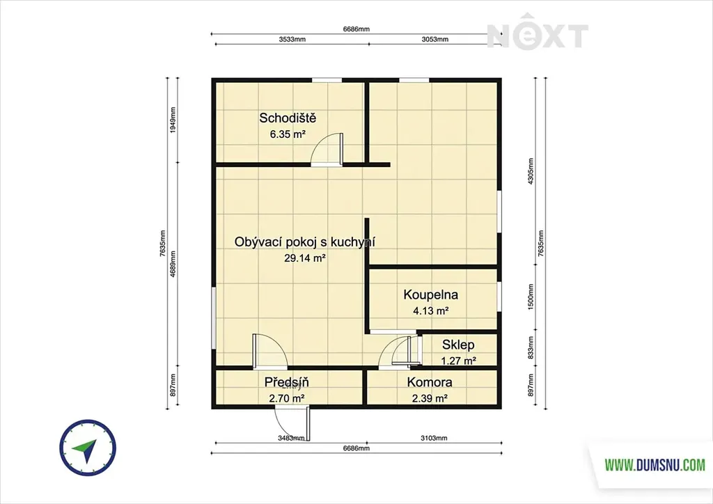 Vchodovými dveřmi vejdete do obývacího pokoje, kde stojí krb, který dům v zimním období příjemně zahřeje. Obývací pokoj je propojen s prostornou kuchyní. Odtud se dostanete do koupelny se sprchovým koutem a toaletou.