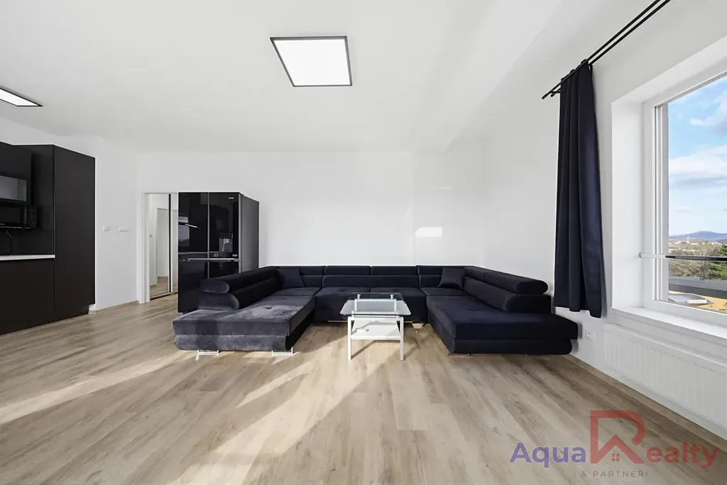 Interiér bytu působí velmi vzdušně a čistě. Dominantou je prostorný obývací pokoj propojený s moderní kuchyňskou linkou v elegantním tmavém designu, která je plně vybavena spotřebiči, včetně myčky, trouby s indukční deskou, mikrovlnné trouby a dvoukřídlé lednice. Obývací část je doplněna o sedací soupravu, konferenční stolek a jídelní kout se stolem a židlemi. Velká okna zajišťují dostatek denního světla a příjemnou atmosféru.