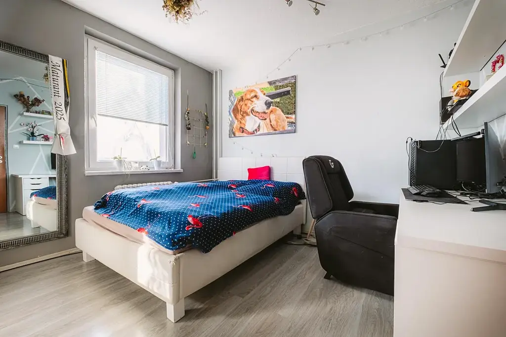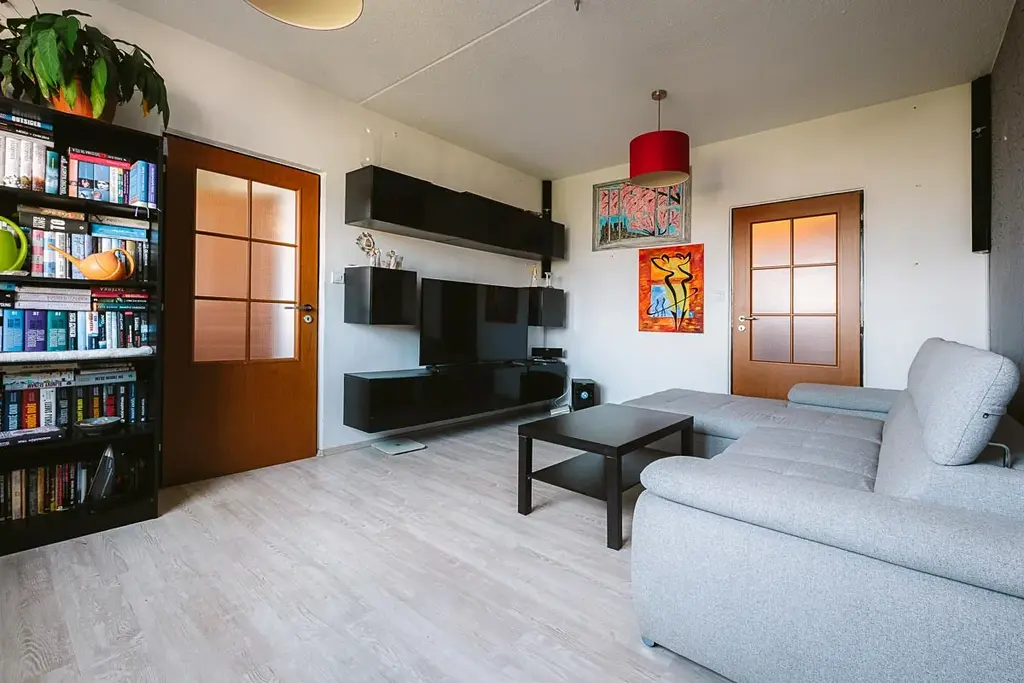 Byt disponuje vstupní chodbou se skříní, samostatným WC, koupelnou s vanou, kuchyňskou linkou se spotřebiči, obývacím pokojem, ložnicí, dětským pokojem a technickou místností. K bytu patří také komora, která se nachází na stejném patře jako byt. Součástí bytu je i sklep v přízemí domu. V bytě je plovoucí podlaha, dlažba a koberce. Poslední rekonstrukce proběhla v roce 2011, zděné jádro, nová koupelna, toaleta a kuchyň. Celý dům prošel revitalizací v roce 2010. Nová fasáda, zateplení, nová okna, vstupní dveře, výtah. Vytápění bytu i ohřev vody je zajištěn dálkově z centrální kotelny. Energetická náročnost budovy je C. Měsíční náklady na bydlení jsou cca 7 500 Kč.