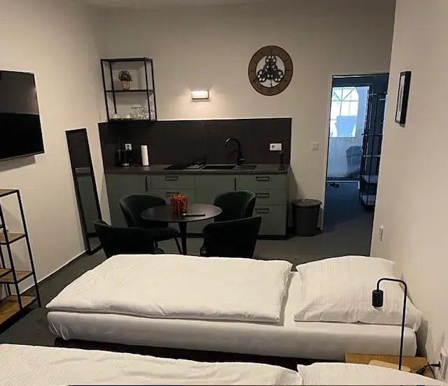 Ve 2.NP nalezneme jeden čtyřlůžkový apartmán (dvě místnosti) a dva třílůžkové