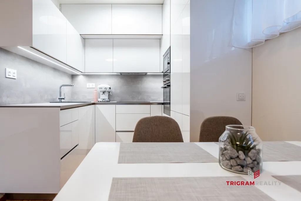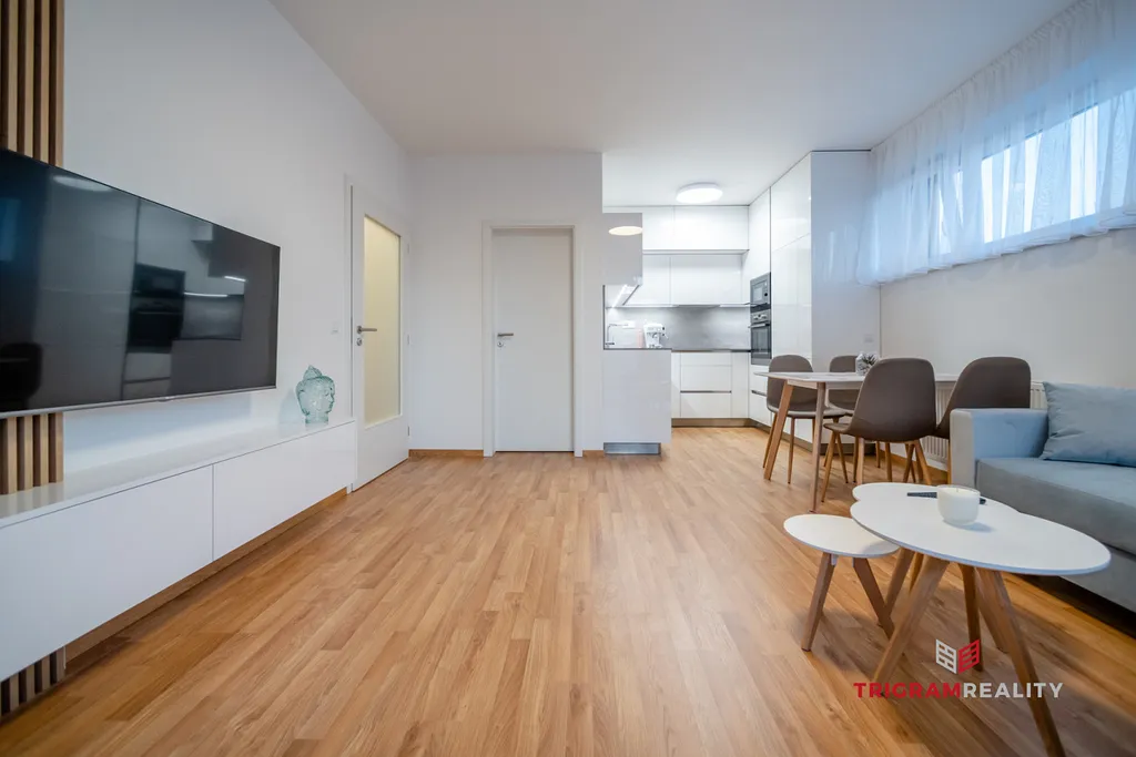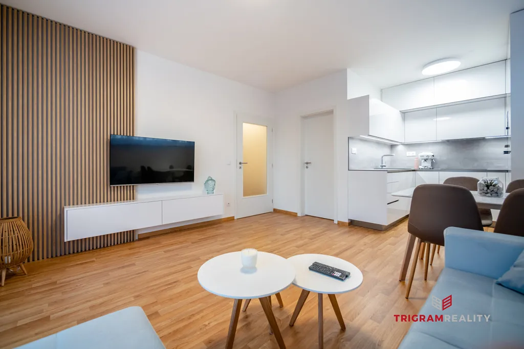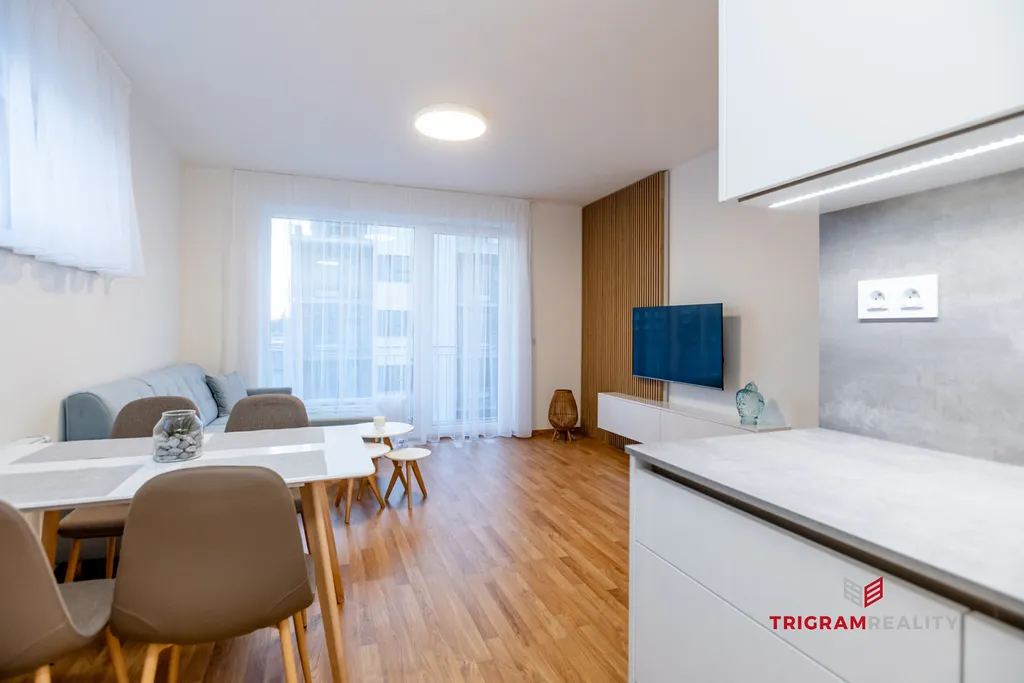 Byt zaujme svým promyšleným dispozičním řešením a vzdušností. Dominantou je vkusně zařízený obývací pokoj s kuchyňským koutem a přímým vstupem na balkon orientovaný na jihozápad, který nabízí příjemné odpolední světlo i klidné posezení.