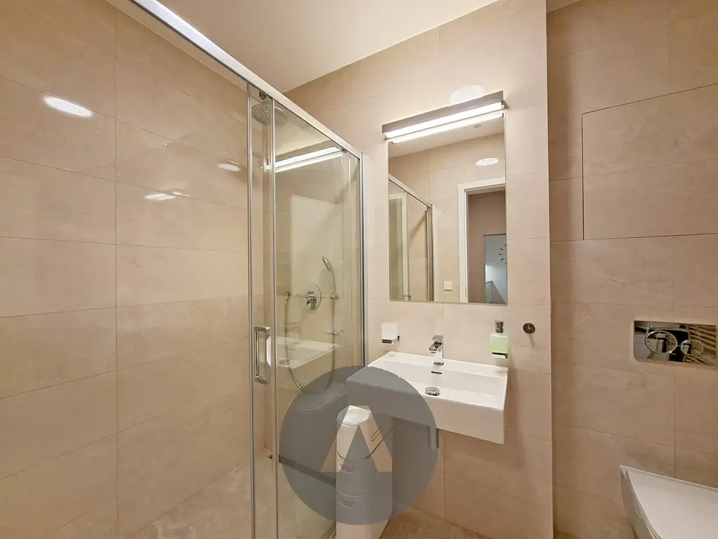 V koupelně se nachází prostorný sprchový kout, umyvadlo, zrcadlo, otopný žebřík a kombinovaná pračka se sušičkou a toaleta.