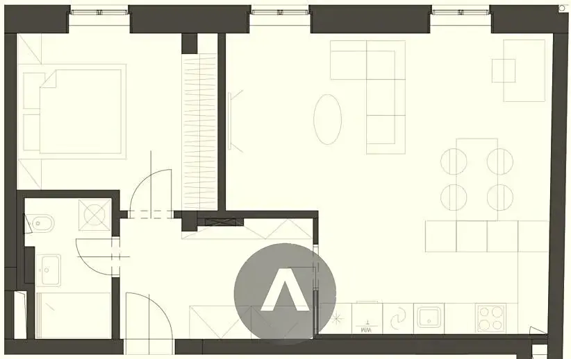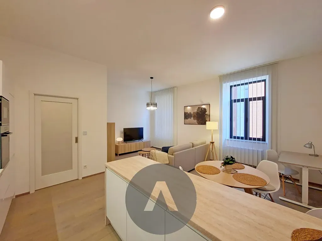 Světlý a prostorný obývací pokoj je vybaven sedací soupravou, konferenčním stolkem, knihovnou, TV stolkem s televizí, polohovatelným pracovním stolem se židlí a jídelním stolem se třemi židlemi. Moderní kuchyně disponuje kuchyňskou linkou s indukční varnou deskou, horkovzdušnou troubou, digestoří, myčkou nádobí, mikrovlnnou troubou a lednicí s mrazicím boxem.