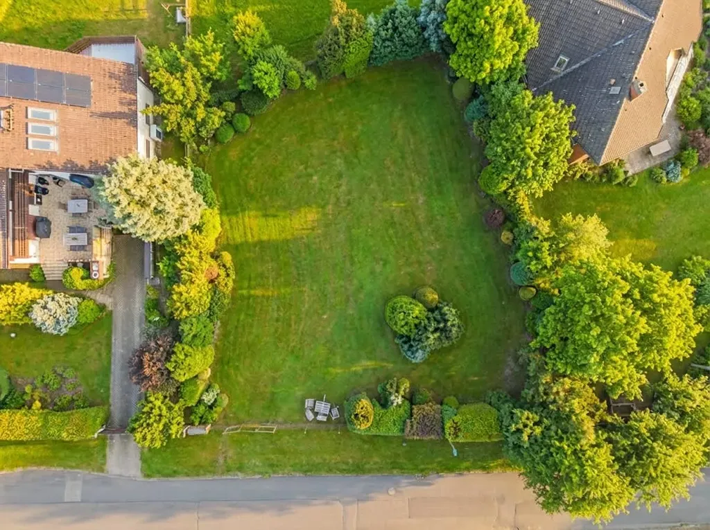 Krásný, rovinatý pozemek se vzrostlými stromy a keři, které zajišťují okamžité soukromí.
