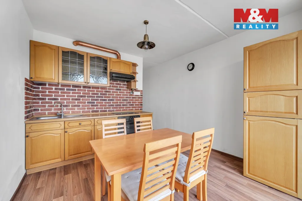 Zařízeno kuchyňskou linkou se sklokeramickou deskou, elektrickou troubou, digestoří, lednicí, jídelním stolem se židlemi a skříněmi.