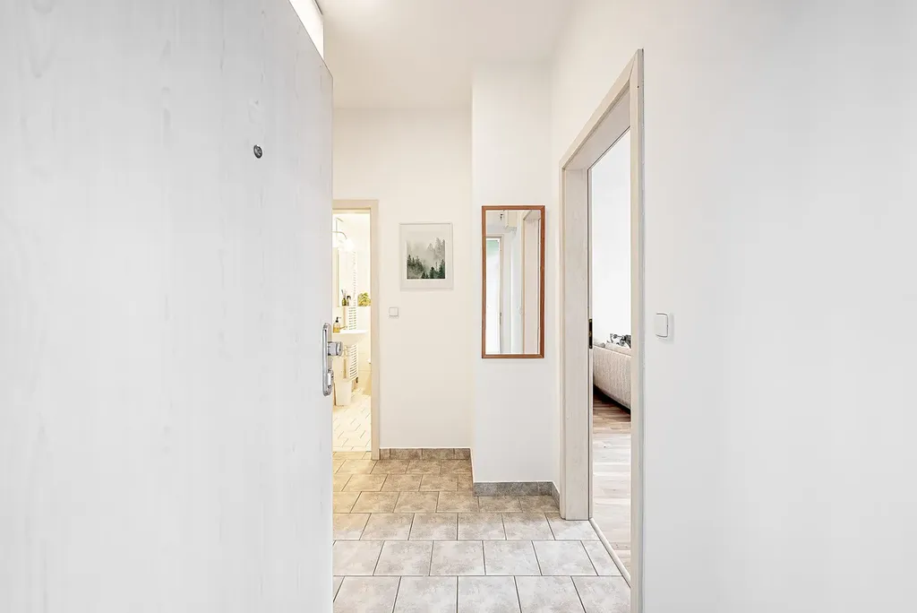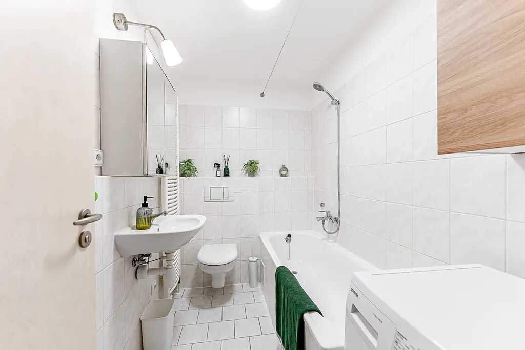 V předsíni se nachází praktické úložné řešení. Koupelna je vybavena vanou, WC a pračkou.
