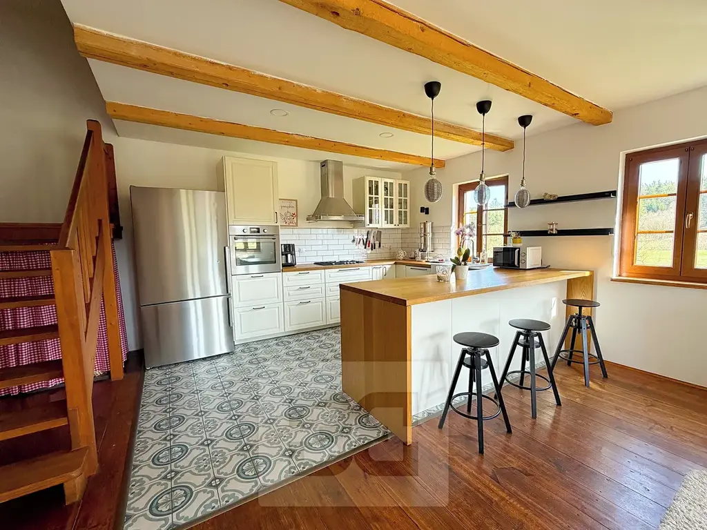 Interiér byl navržen s důrazem na komfort, kvalitu a harmonii s okolní přírodou. Najdete zde moderní spotřebiče, pečlivě vybrané materiály a vkusné provedení, které vytváří pocit tepla, klidu a opravdového domova.