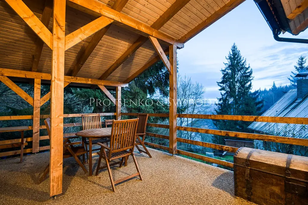 Před vstupem je prostorná terasa – a díky zastřešení si tu vychutnáte kávu i tehdy, když přijde letní přeháňka. A ten výhled? Ten je návykový.