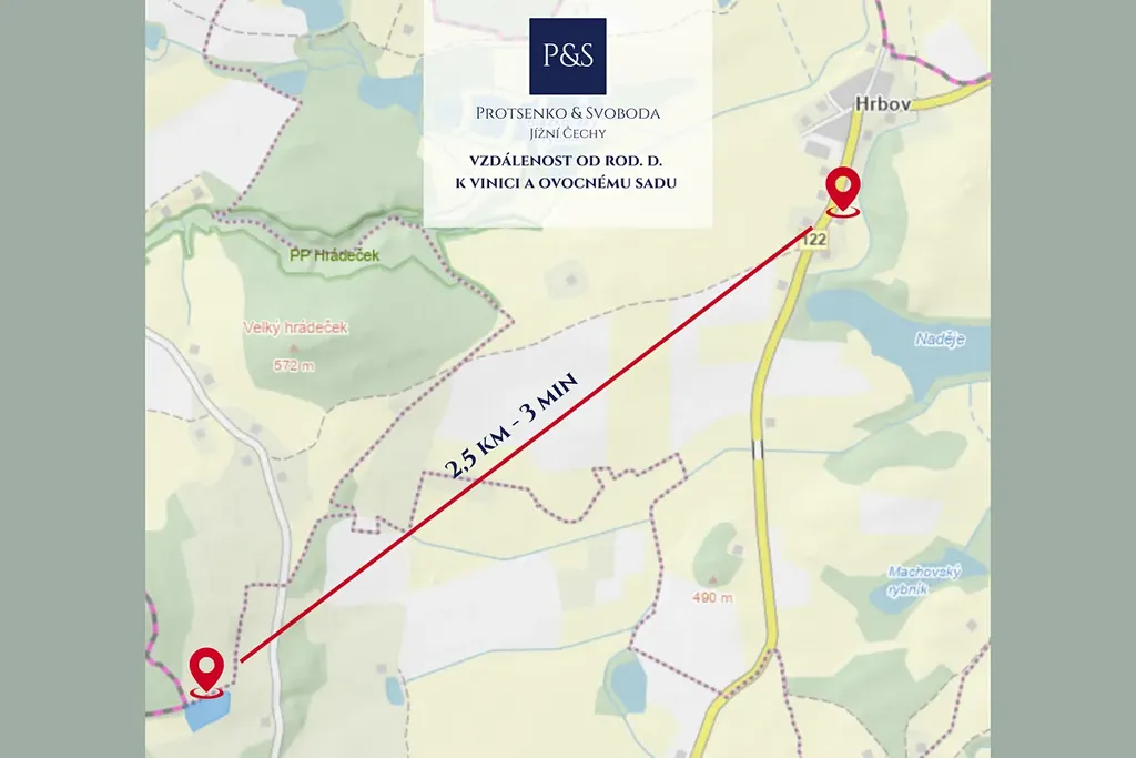 Druhou část nabídky tvoří pozemek o výměře 7.971 m², vzdálený přibližně 2,5 km. Vinice a ovocný sad, kde přibližně třetinu plochy tvoří osázená vinice. V blízké době bude pozemek rozdělen na tři samostatné parcely, což přináší další investiční rozměr – možnost budoucího prodeje části pozemku nebo dalšího rozvoje.