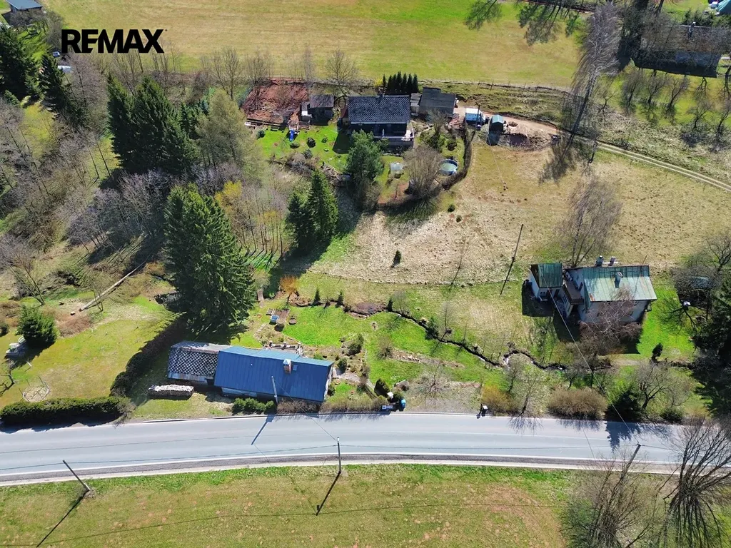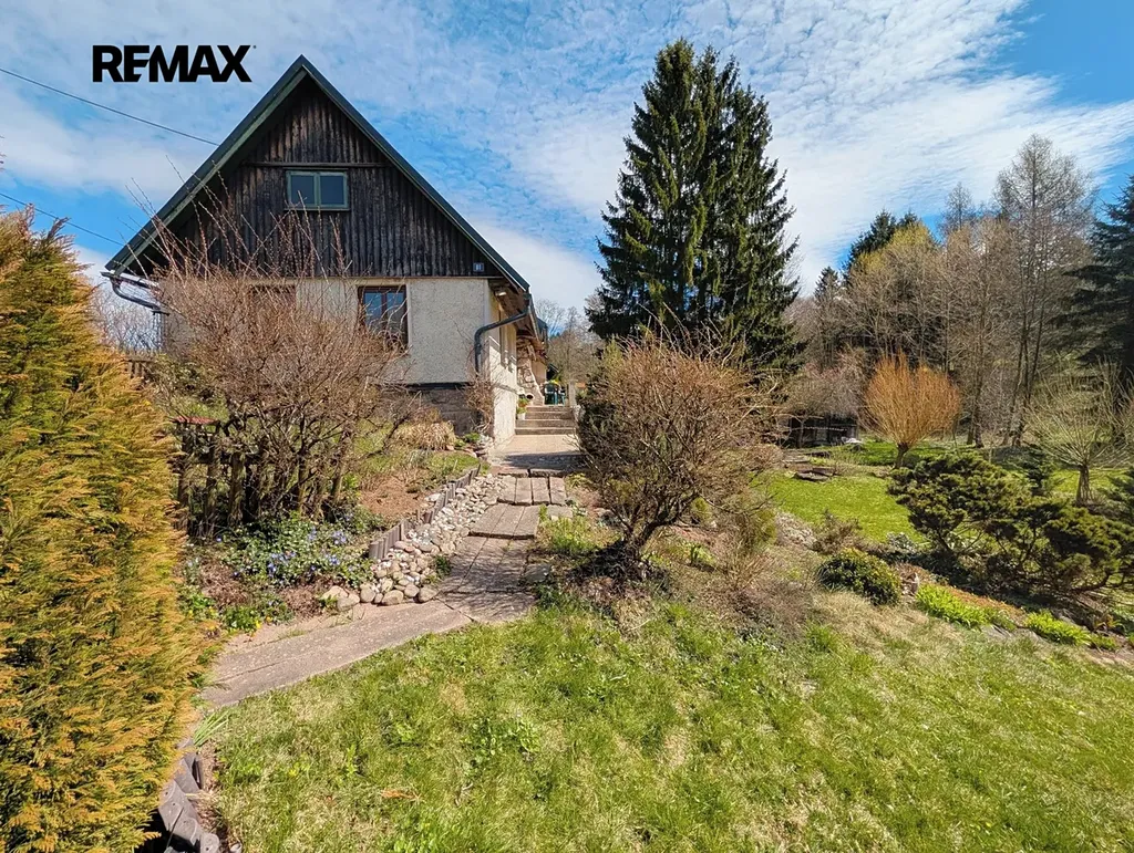 Velkým benefitem je pozemek o rozloze 1 944 m², který poskytuje dostatek soukromí i prostoru pro odpočinek. Zahradou navíc protéká vlastní potok. K domu náleží také slunná terasa s posezením a výhledem do zeleně.