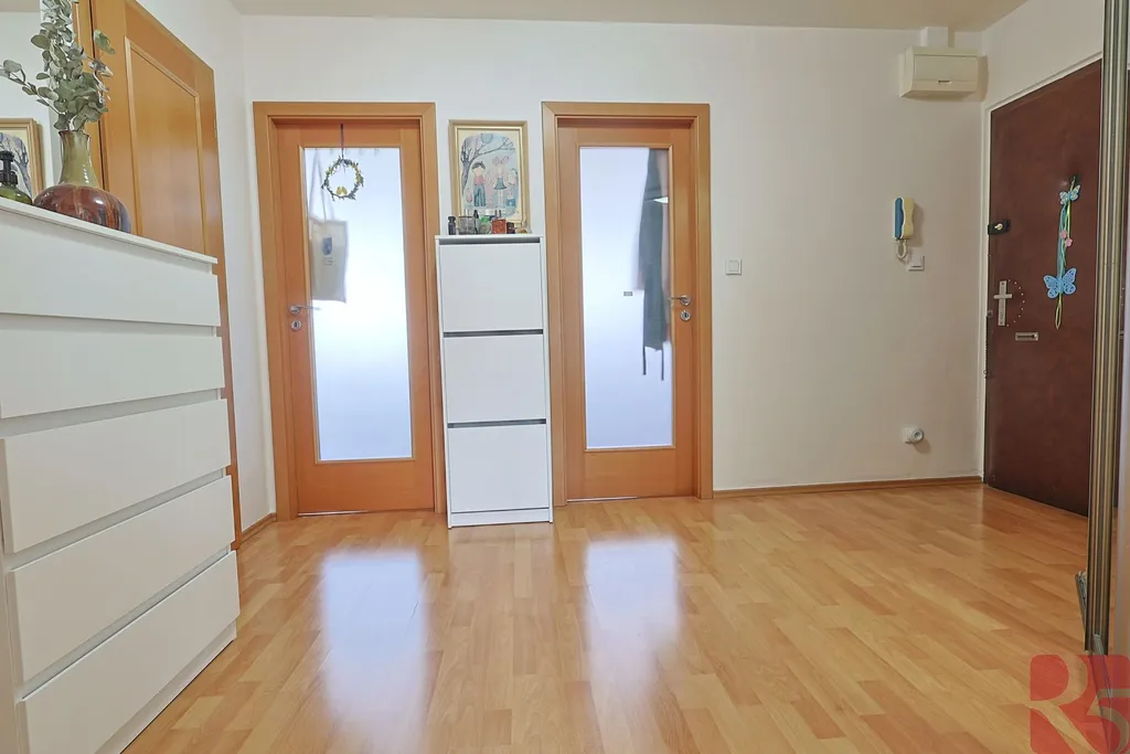 Oba pokoje, každý o rozloze přibližně 13 m2, disponují vestavěnými šatními skříněmi, které nabízejí dostatek úložného prostoru, a zároveň z nich je možné si užívat volný a inspirativní výhled až do centra Prahy. Na světlý obývací pokoj plynule navazuje jídelní část a moderně zařízená kuchyň, ze které se otevírá vstup na příjemnou zasklenou lodžii, ideální pro ranní kávu nebo večerní relaxaci.