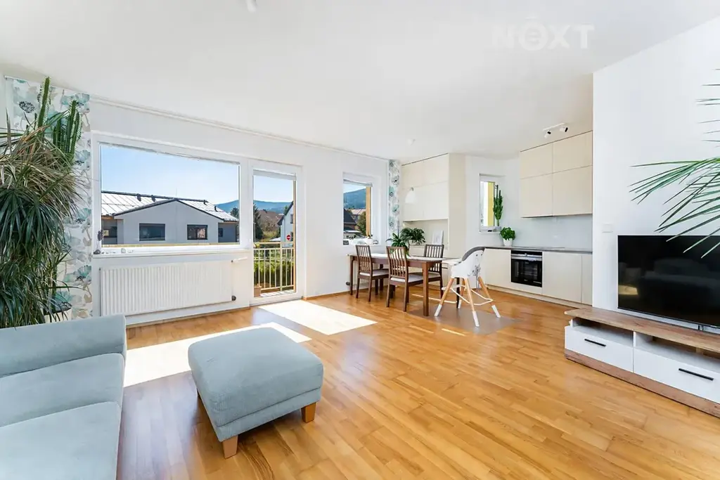 Byt je velmi pěkně zařízen, má dřevěné podlahy, kuchyň na míru s kamennou deskou.