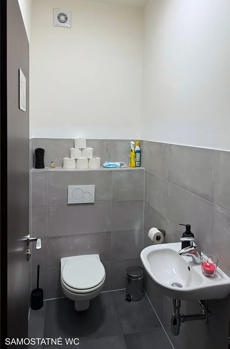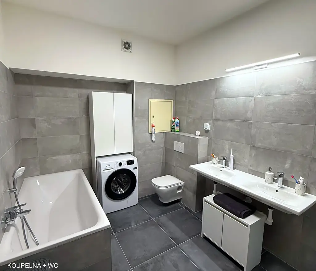 Koupelna je s vanou i sprchovým koutem, WC je samostatné.